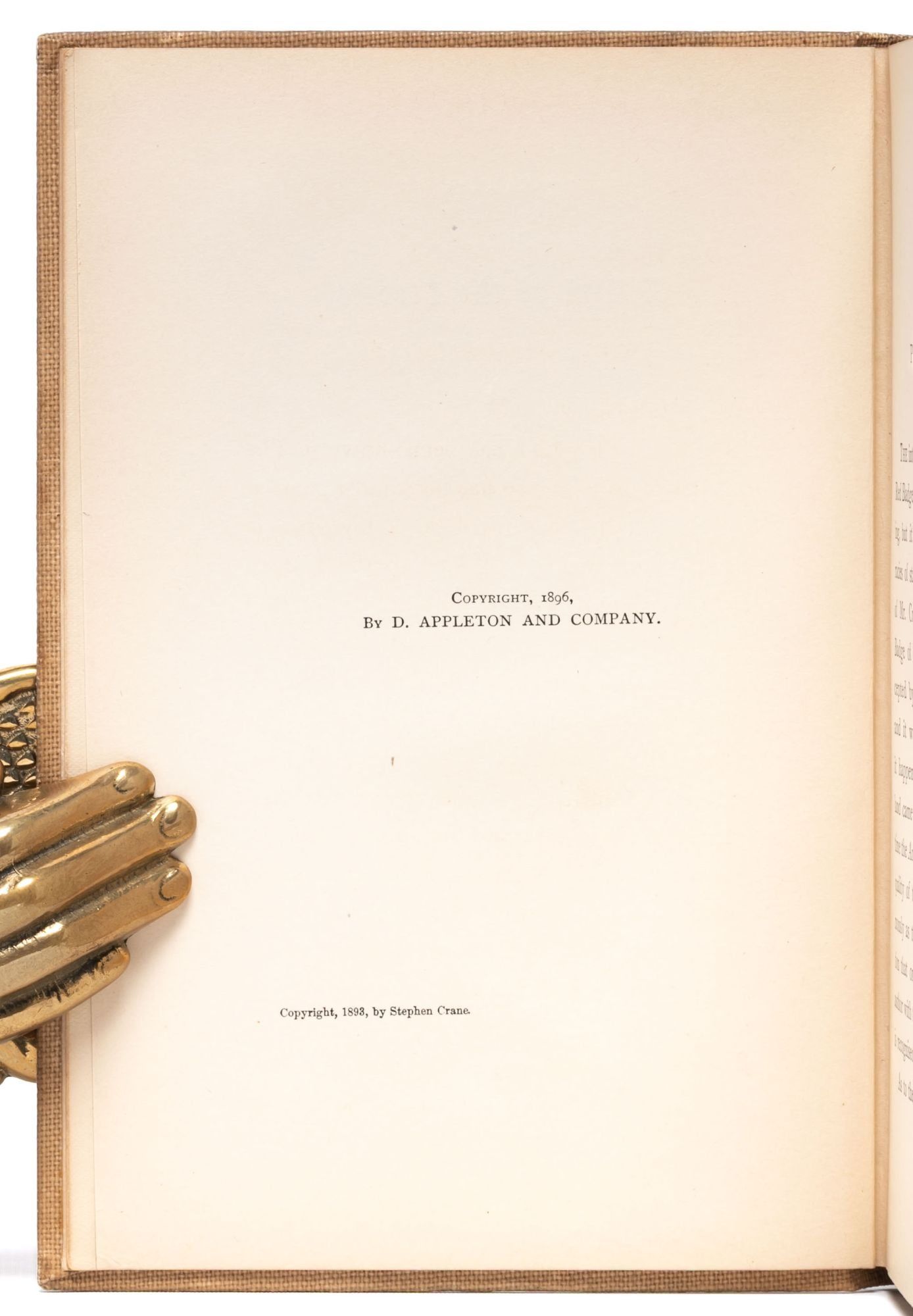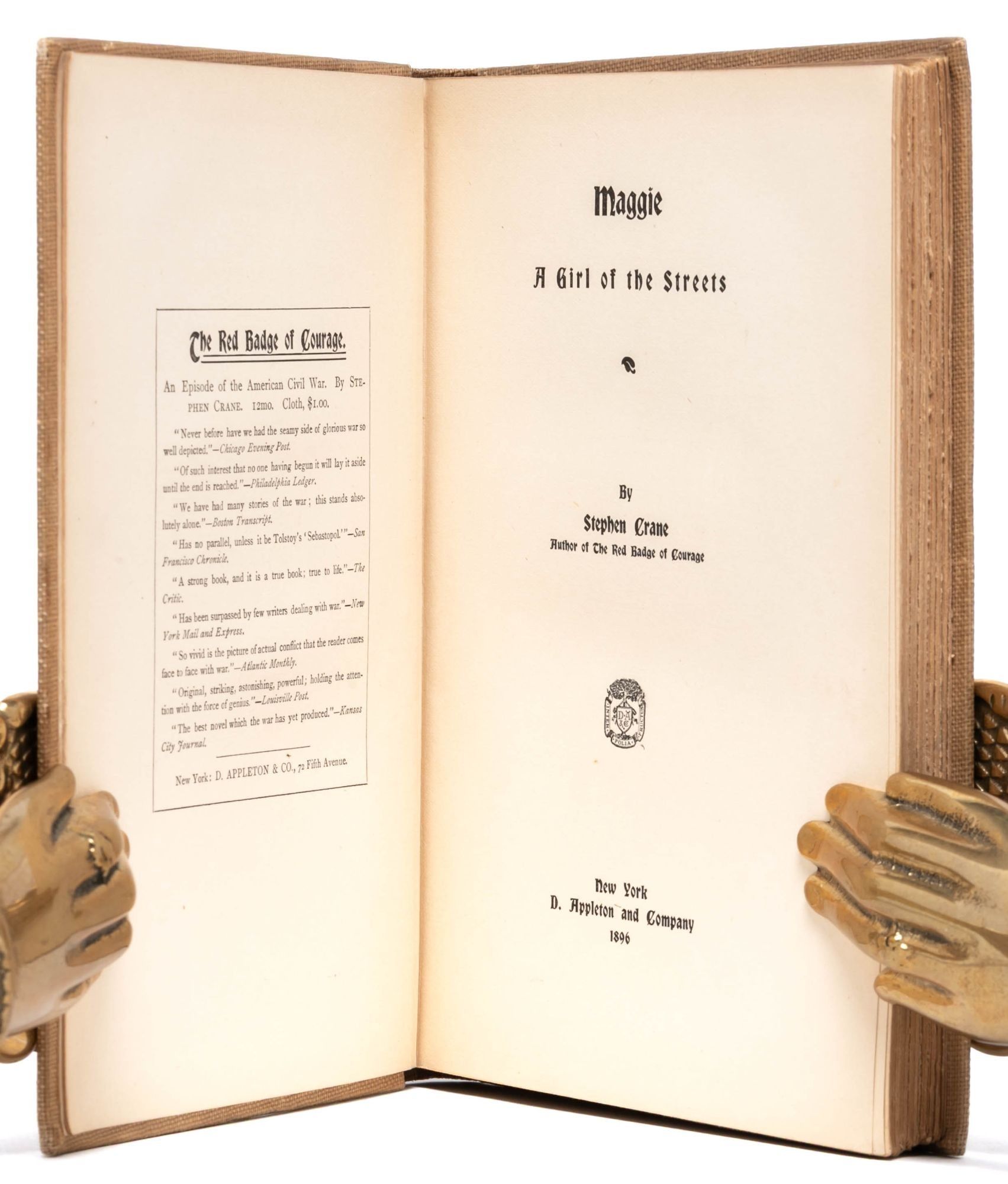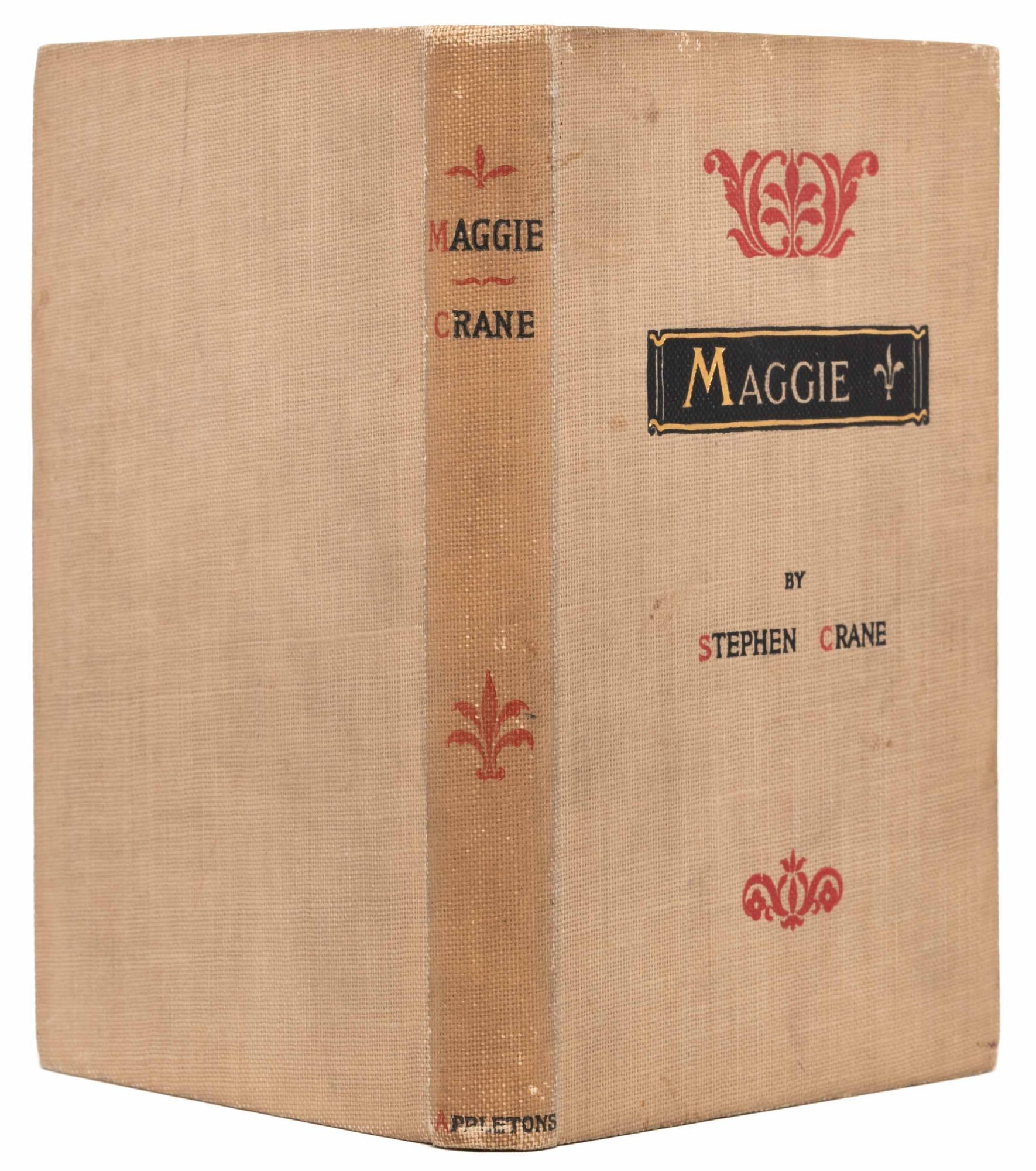 New York: D. Appleton and Company, 1896. First trade edition. Near Fine. This 1896 edition was the first to be widely available after Crane privately published the work in 1893 in wrappers (now quite scarce); also, the first edition published under Crane's real name. This copy in the first state according to BAL (title-page printed in upper and lower case letters). An attractive, Near Fine copy. Octavo. iv, 158, [12] pp. 120 x 183 pp. Publisher's buckram stamped in black, red, and gilt. Spine a bit toned and some minor dustsoiling to cloth. Remarkably clean and fresh throughout.
