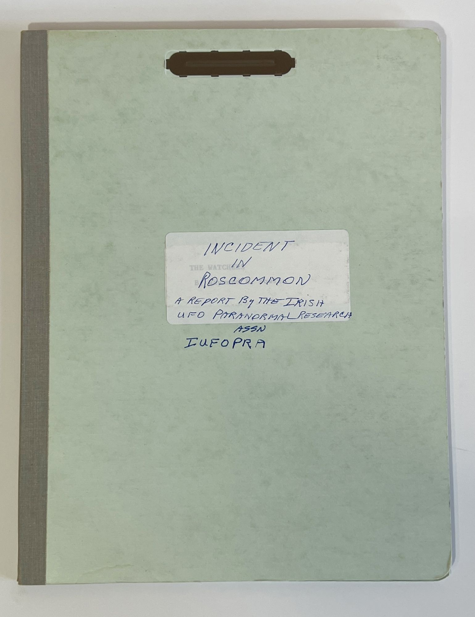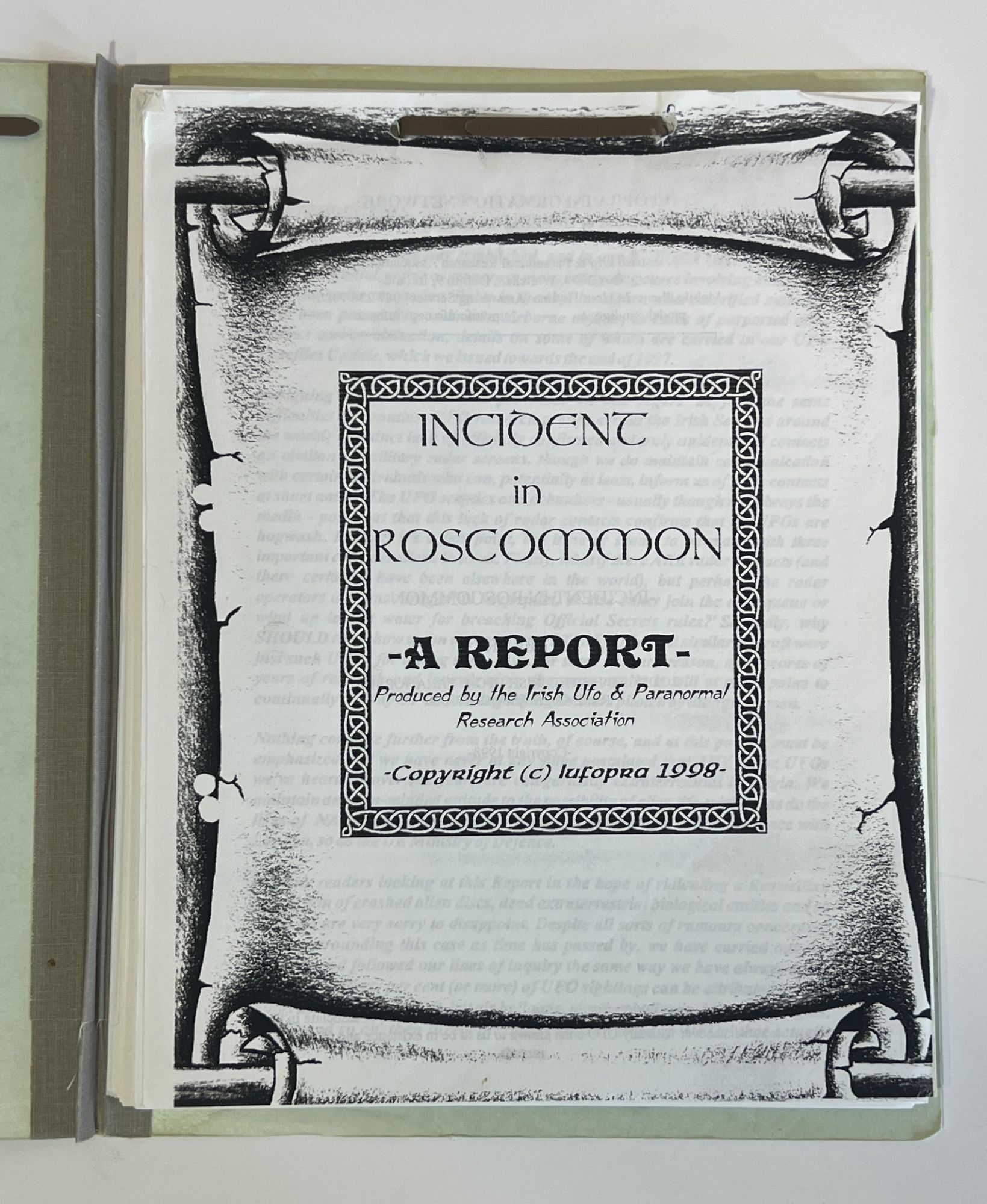 Dublin: Iufopra, 1998. Folder. Near Fine. 63p., photocopied reproduction. Very Good. Green folder with manuscript title on the front pastedown and slightly below. Pages firmly bound in the prong binding, title page bumped at the top edge, a few pages with the bottom line or two cut off from poor scanning, clean otherwise. A thorough and measured report on the sensational UFO sighting in Ireland, with scans of letters and news reports. From the collection of ufologist Tom Benson.