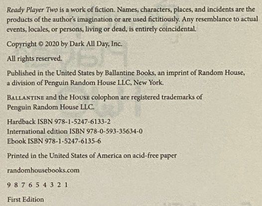 New York: Ballantine Books, 2020. First Edition. Hard Cover. Near Fine/Near Fine. 6x1x9. First edition. Appears to have been gently read. Minor blemishes on jacket reverse. Binding tight and square, pages clean, bright, and unmarked. 2020 Hard Cover. 370 pp. An unexpected quest. Two worlds at stake. Are you ready? Days after winning OASIS founder James Halliday's contest, Wade Watts makes a discovery that changes everything. Hidden within Halliday's vaults, waiting for his heir to find it, lies a technological advancement that will once again change the world and make the OASIS a thousand times more wondrous - and addictive - than even Wade dreamed possible. With it comes a new riddle, and a new quest - a last Easter egg from Halliday, hinting at a mysterious prize. And an unexpected, impossibly powerful, and dangerous new rival awaits, one who'll kill millions to get what he wants. Wade's life and the future of the OASIS are again at stake, but this time, the fate of humanity also hangs in the balance.