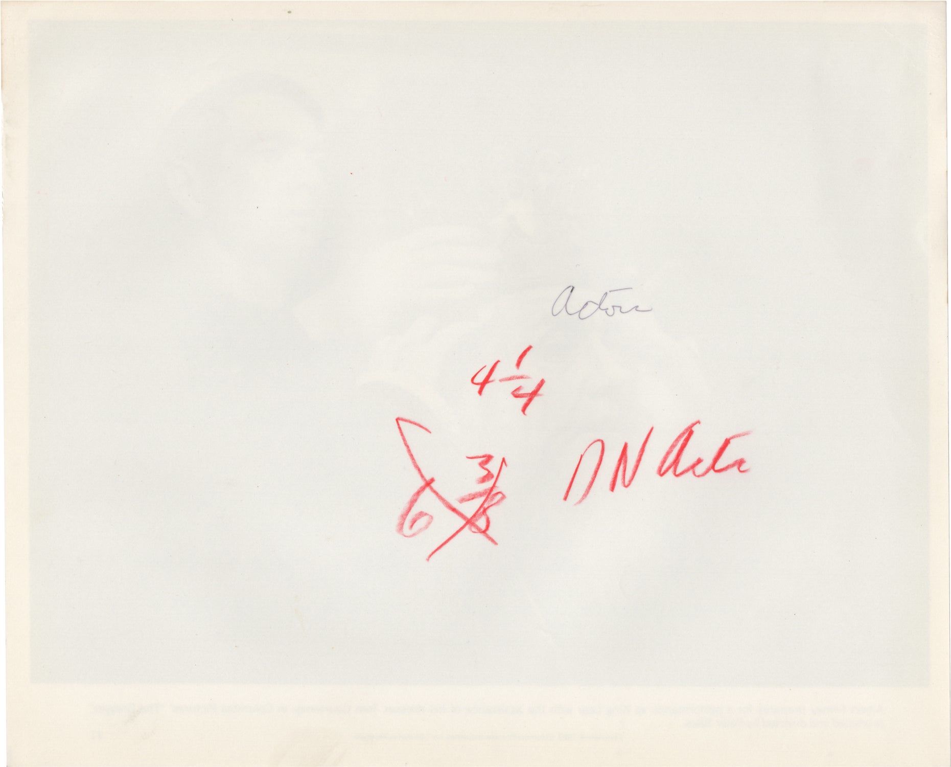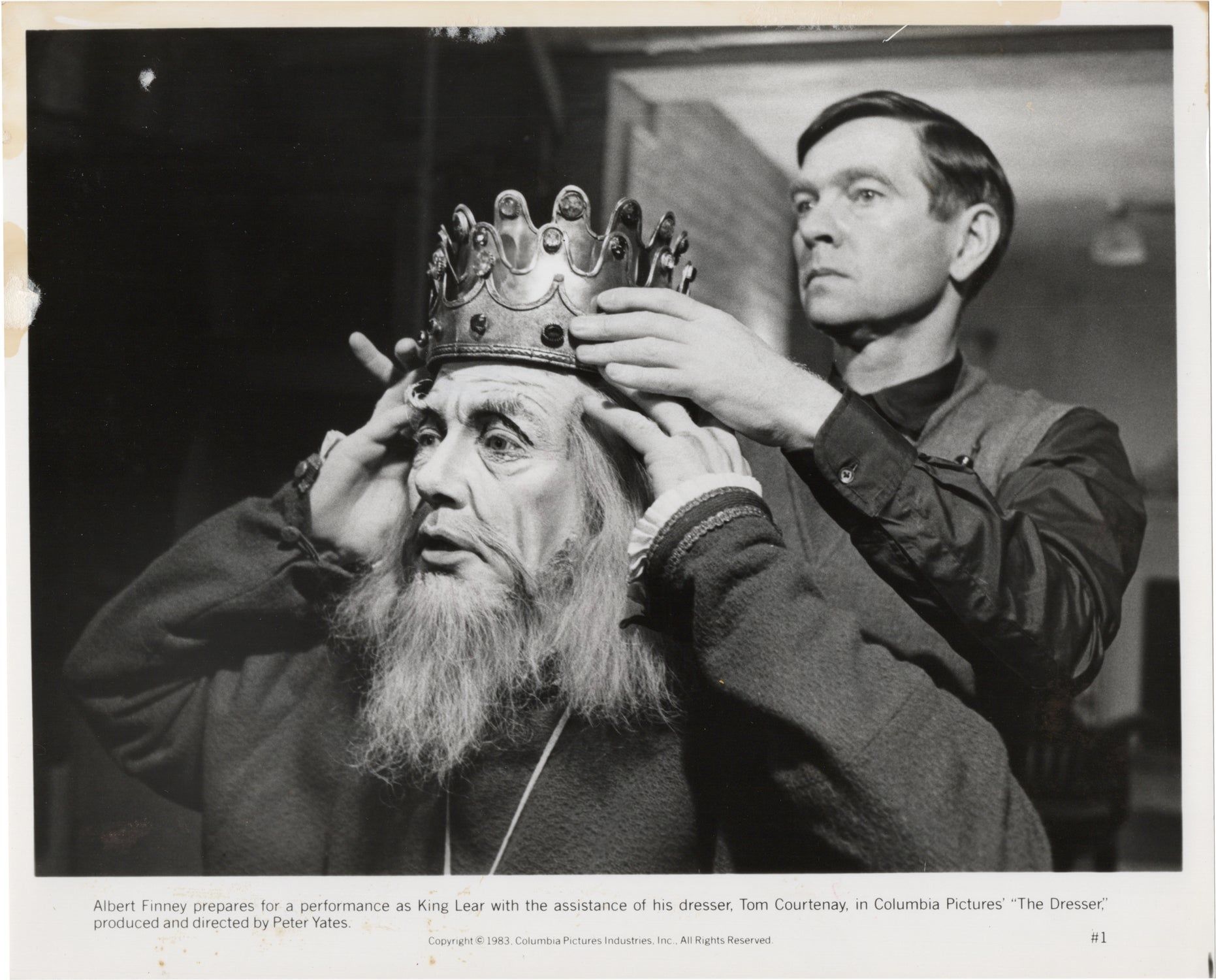 Culver City, CA: Columbia Pictures, 1983. Vintage reference photograph from the 1983 film, showing actor Albert Finney preparing for a turn as King Lear, with help from his dresser Tom Courtenay. Annotations in manuscript pencil on the verso.