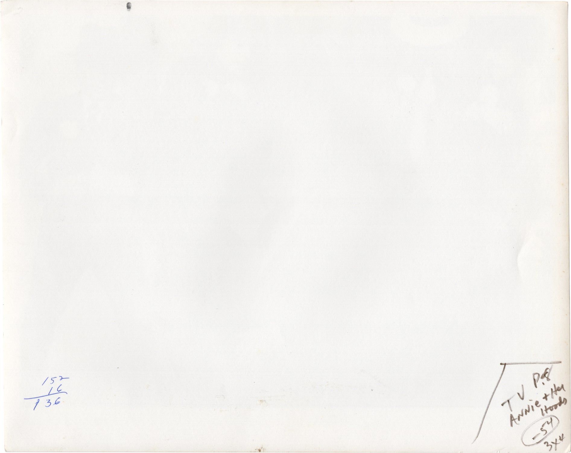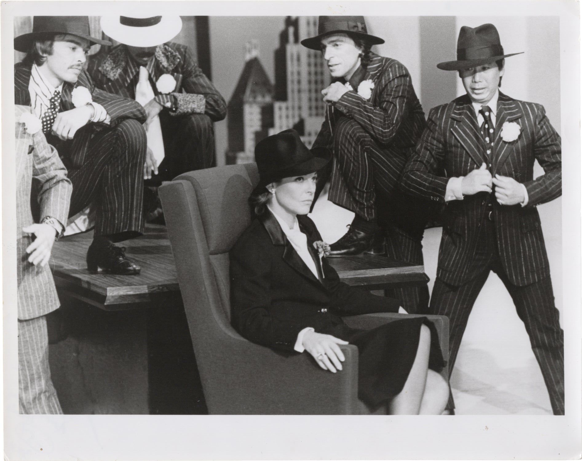 N.p.: N.p., 1974. Vintage reference photograph from the 1974 television musical comedy special, showing Anne Bancroft surrounded by pinstripe-suit-sporting gangsters. Annotations in manuscript ink on the verso.