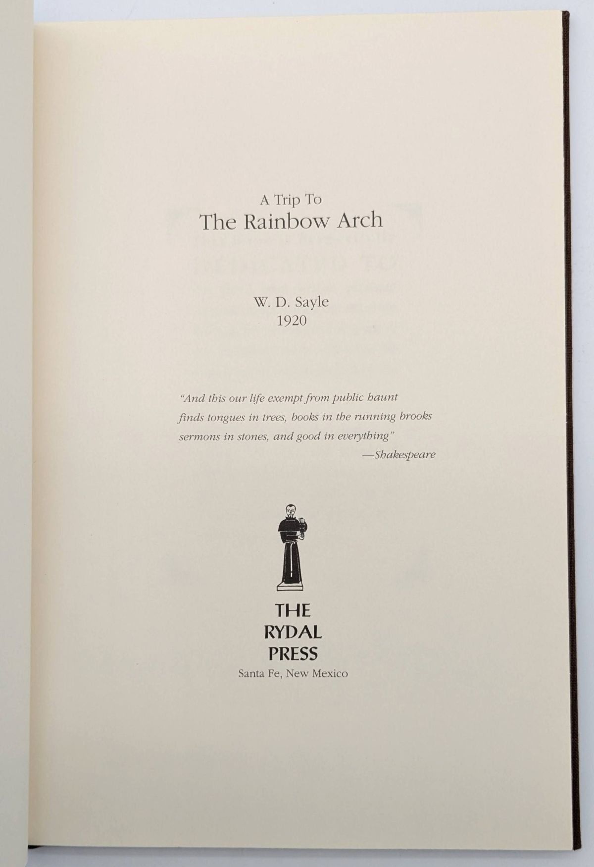 The book describes the writer's journey to Rainbow Arch and several side trips in Arizona, a work which was originally privately published by the author in 1920.