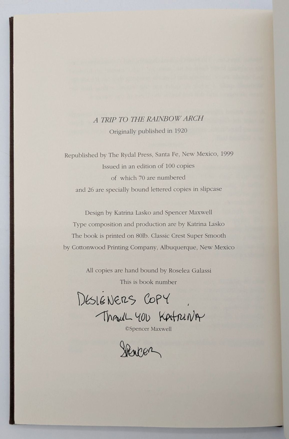 Santa Fe: The Rydal Press, 1999. Limited Edition. Hardcover. Near Fine. SIGNED. Unpaginated [72 pp]; octavo [23 cm]; full brown cloth with printed paper title label on the spine. Issued in an edition of 100 copies, this unnumbered association copy is inscribed and signed by one of the book designers (Spencer Maxwell) to the other book designer (Katrina Lasko) on the colophon page at the rear: "Designers Copy, | Thank you Katrina | Spencer."