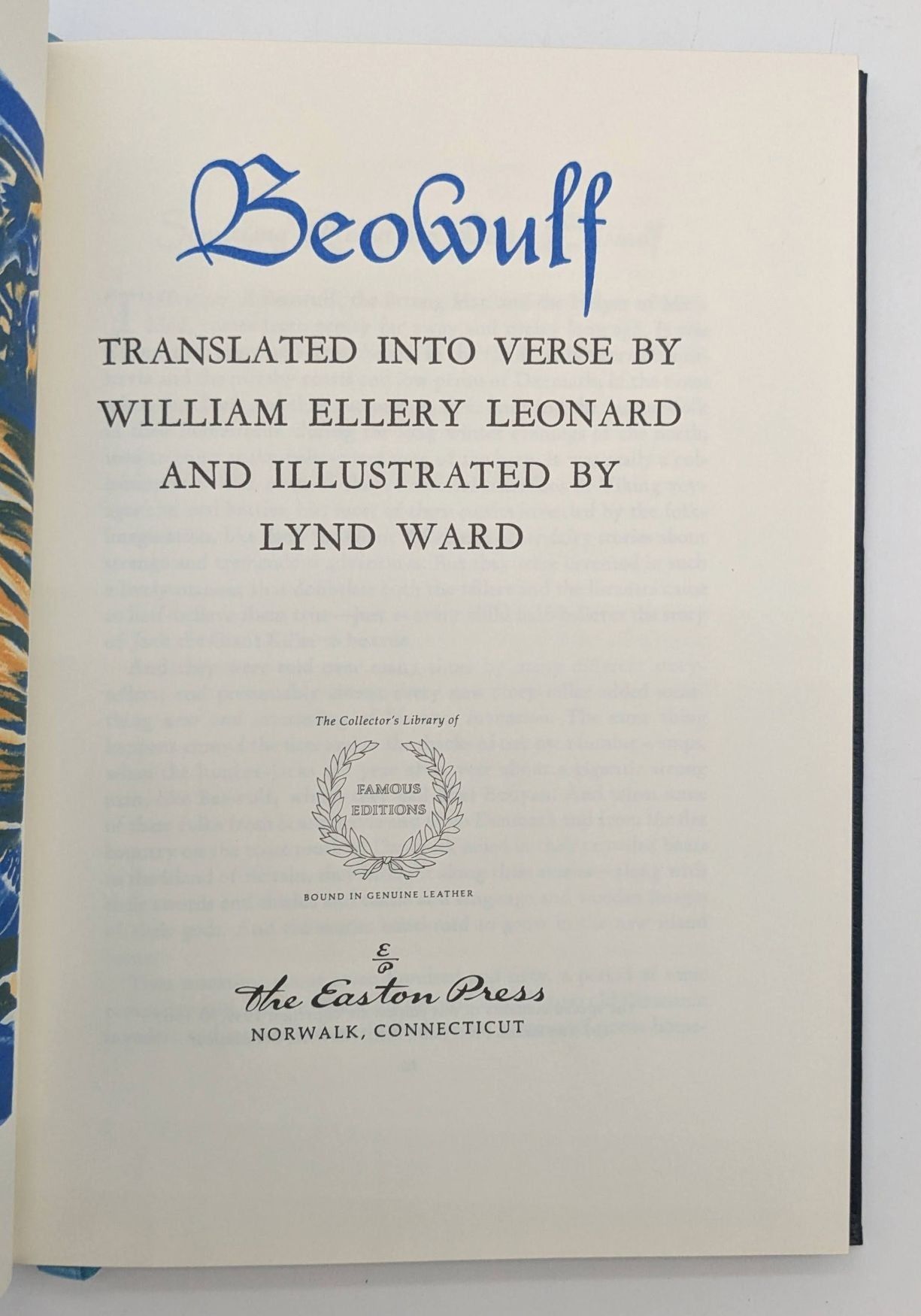 Norwalk, CT: The Easton Press, 1967. The Collector's Library of Famous Editions. Leather Bound. Near Fine. Lynd Ward. 119 pp. Quarto [27 cm]; full blue leather with raised bands, gilt stamped titles and designs. All edges gilt. Blue moire endsheets. A nice copy. Lynd Ward illustrated edition of the Old English epic.