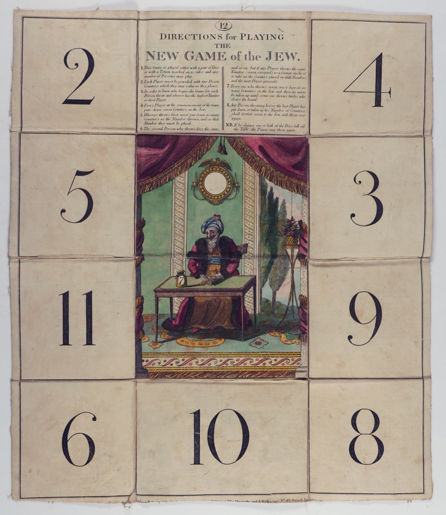 Such games are now often categorized under the recent German term Glückshaus (Lucky House), although Richter suggests that Games of Seven might be better designation as the early modern names often refer to the central number 7, the most common throw yielded by a pair of six-sided dice: Der Siebener Trinckt (the seven drinks); Zevenzot (Fool of Seven). Other early names refer to the central graphic element on the board, as the Dutch Arlequinspel (Harlequin game) and the Italian Gioco della Barca (Game of the Boat). The present version invokes the cliché of Jewish usury and avarice, in the form of a Jew clothed in an elaborate robe and turban, seated before a table arrayed with bags of gold coins, within a tent suggestive of an exotic eastern locale. First appearing in the late 18th century in France (Jeu du Juif), later versions of the Game of the Jew were published in the Netherlands (Het nieuw vermakelyk Spel, gevolgt na 't Fransch, genaamt de Jood - the New and Entertaining Game, after the French, called The Jew), Spain (Juego de los Judios) and, as in the present case, England.