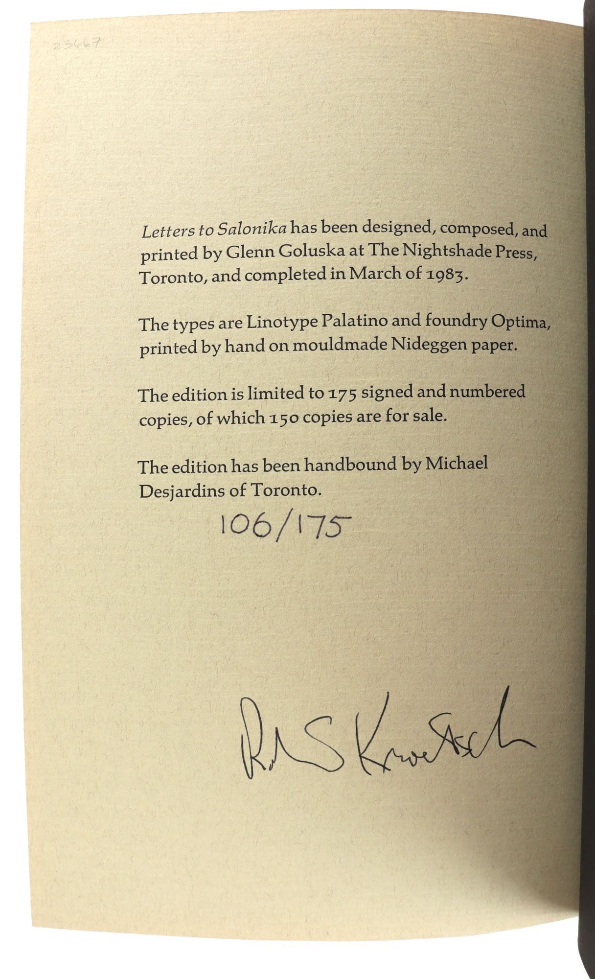 Toronto: Grand Union Press, 1983. Very Good+. Toronto: Grand Union Press, [1983]. First Edition, Limited to 175 copies of which this is no. 106. Slim octavo (23.5cm); publisher's cloth-backed boards, printed paper spine label; [36]pp. Light wear to board margins, cloth spine a bit sunned, else Very Good or better. Signed by the author on colophon in rear.