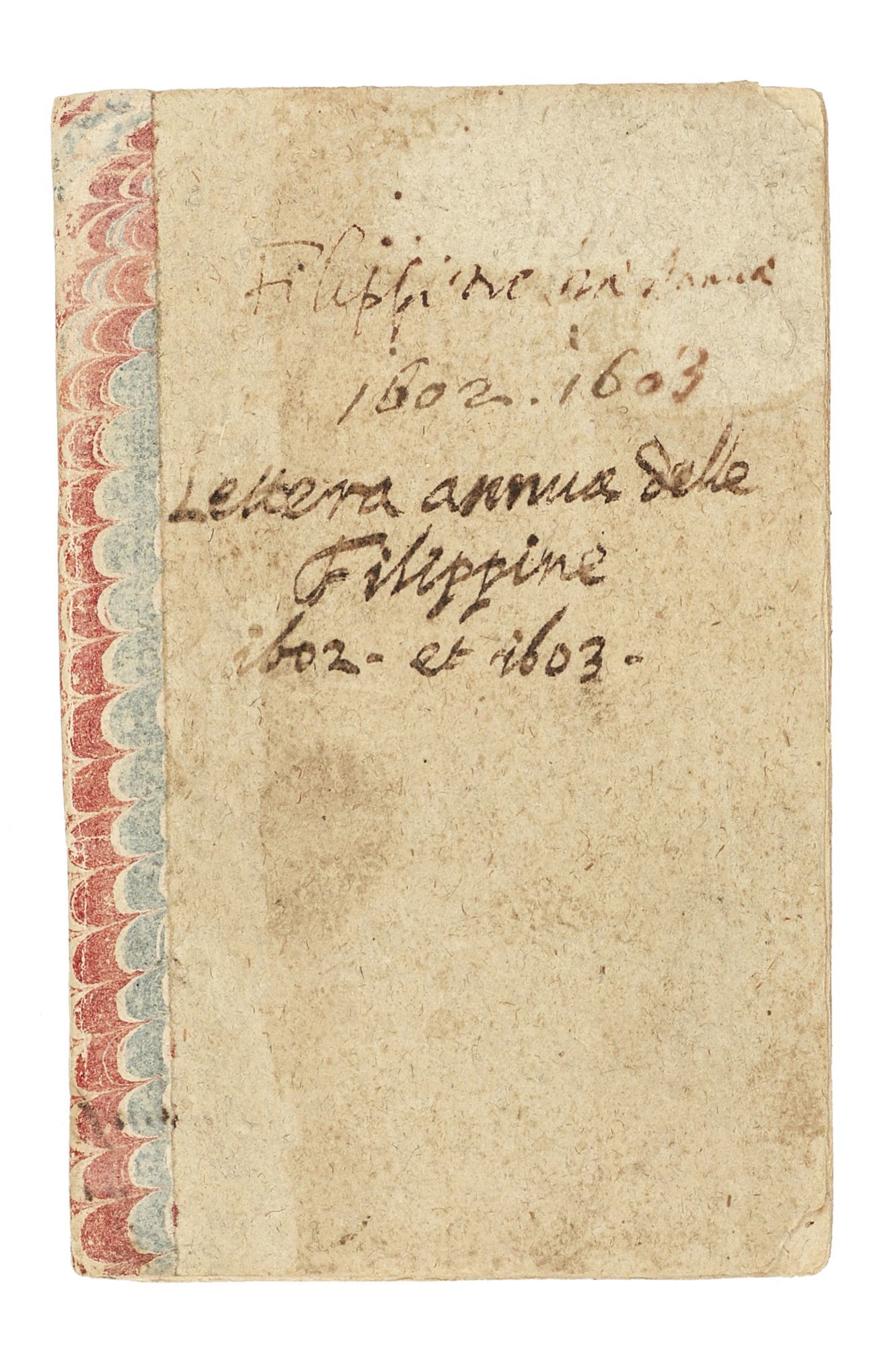 Venice: G. Battista Ciotti, 1605. SECOND EDITION (printed in the year of the first.). Hardcover. Fine. Bound in 17th c. carta rustica with a marbled guard along the spine (small losses at the corners) and the title in a 17th c. hand on the upper cover. A fine, unsophisticated copy with some very light marginal foxing, first few leaves dog-eared at lower corner, title with 17th c inscription causing small hole at corner (from ink burn.). This is only the second relation to deal exclusively with the Jesuit mission in the Philippines, preceded by Pedro Chirino's report of the previous year. It provides one of the earliest eyewitness portrayals of life among the peoples of the central Philippines. Written from Manila by Juan Ribera or Rivera, S.J. (1565-1622), the letter describes events from June 1602 to June 1603, a year marked by institutional growth and by crises of war, disease, and conversion.