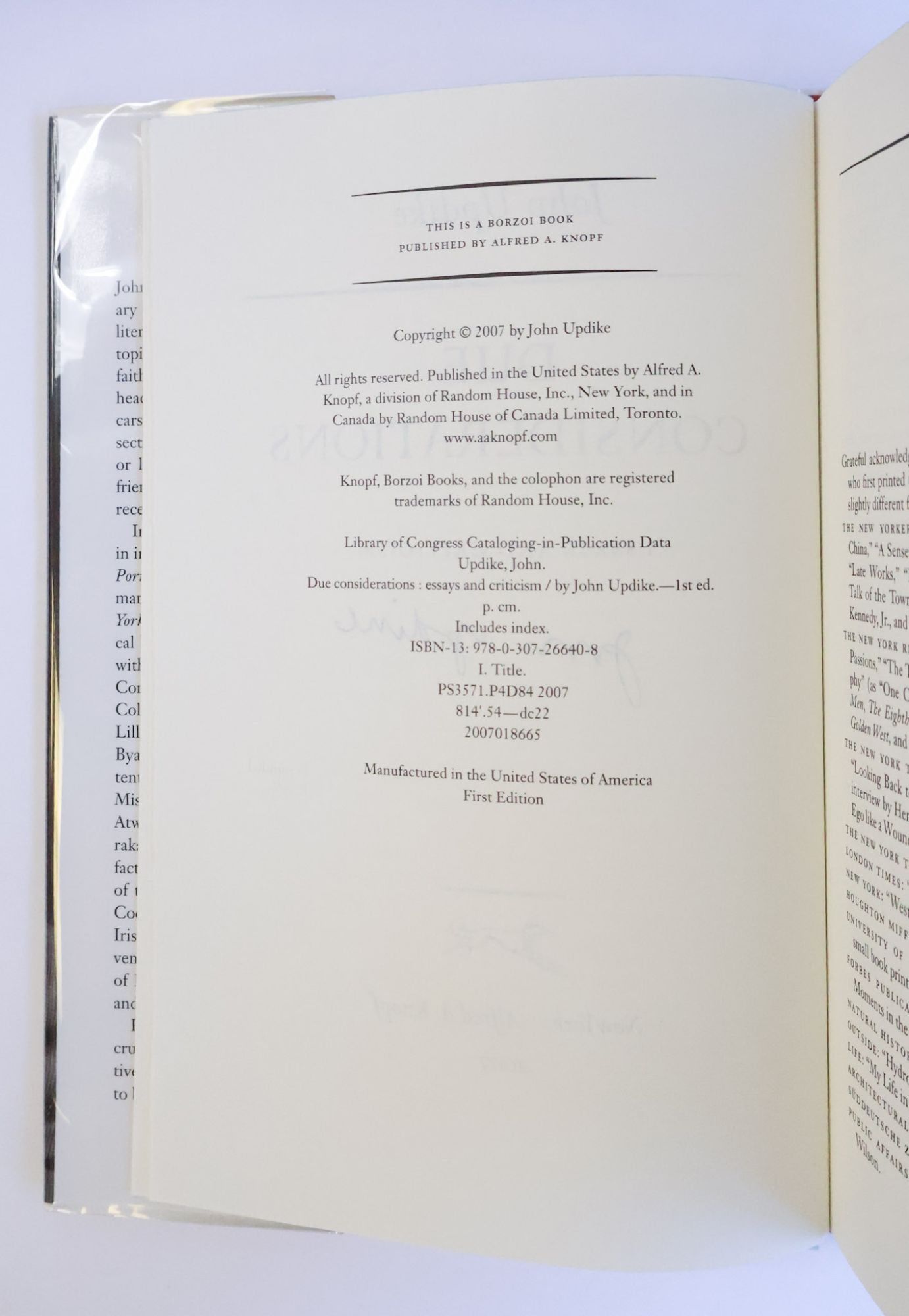 New York: Alfred A. Knopf, 2007. First Edition, First Printing. Hardcover. Octavo, xxii, 703 pages. In Very Good condition with a Very Good dust jacket. Spine black with white and teal lettering. Dust jacket protected with a mylar covering, price uncut: "$40.00." Minor shelf wear. Fading to blue dye on top edge of textblock. Fore edge of textblock deckled. Signed flat by Updike on title page. Shelved in Case 12. 1405853. Shelved Dupont Bookstore.