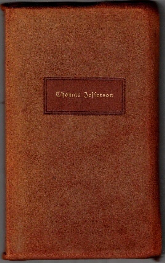 East Aurora, NY: The Roycrofters at their Shop, 1906. Presumed first trade edition. Leather Bound. Very Good. 105pp. Octavo [21 cm] Limp brown suede wraps. Yapp edges. Top edge gilt. Red moire pastedowns. Frontispiece portrait. Printed on Italian hand-made paper. Text printed in black and red. Text block cracked at the beginning, but still very sturdy. Pages lightly foxed. Contains two articles on Thomas Jefferson: Thomas Jefferson; Thomas Jefferson: The Radical.