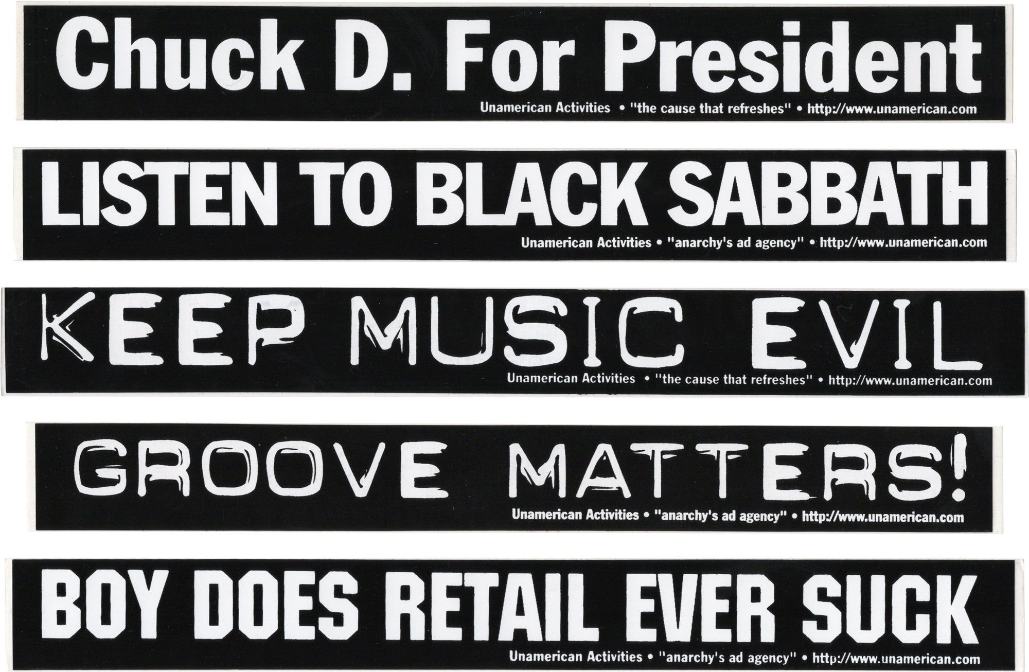 The five sample stickers are: "Boy Does Retail Ever Suck," "Groove Matters!," "Listen to Black Sabbath," "Keep Music Evil," and "Chuck D. For President."