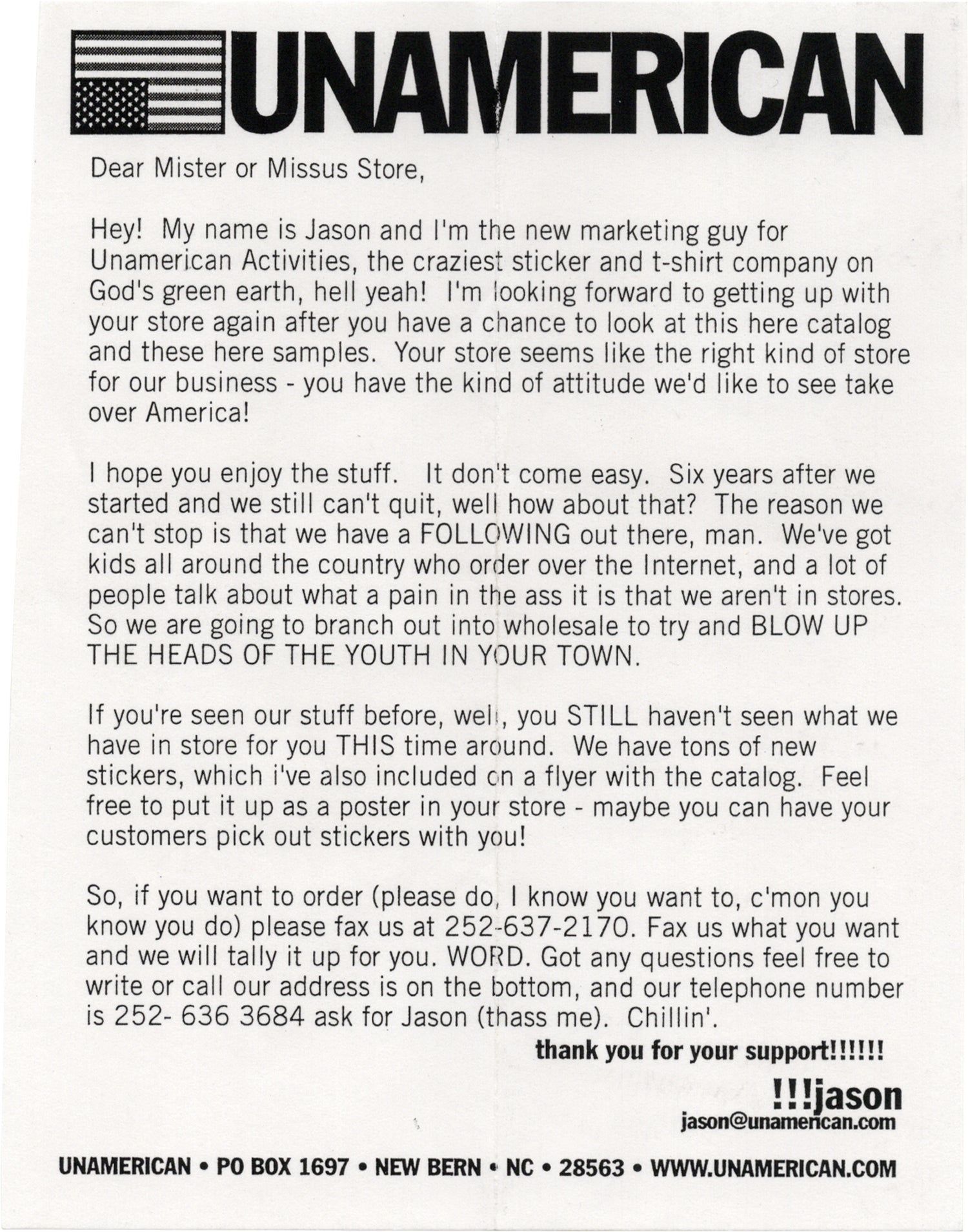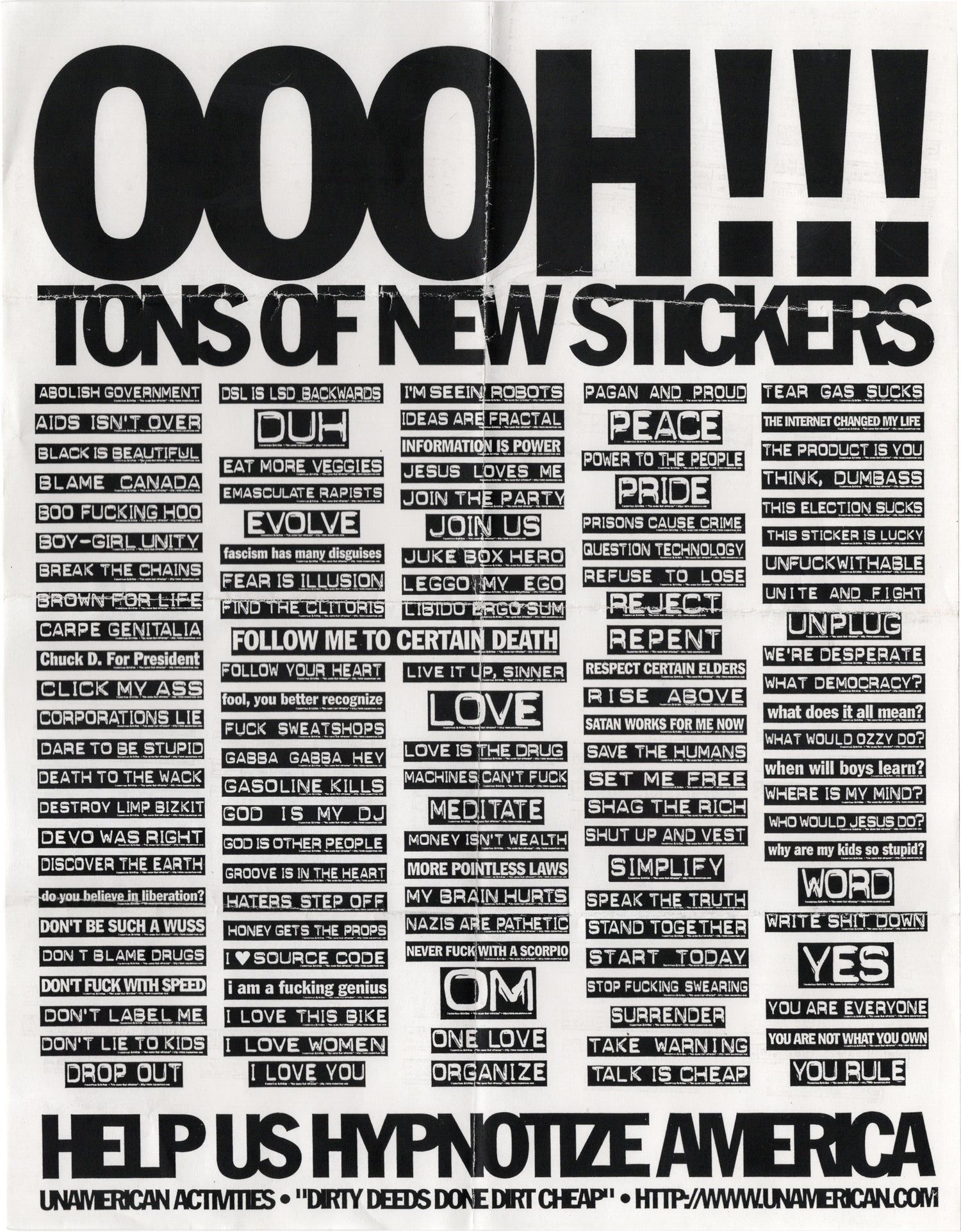 New Bern, NC: Unamerican Activities, 2001. Vintage Spring 2001 catalog, a "Oooh!!! Tons of New Stickers" flyer, a small contact sheet from "!!!Jason" at Unamerican Activities, and five sample stickers, sent to a New York area record store, 2001.