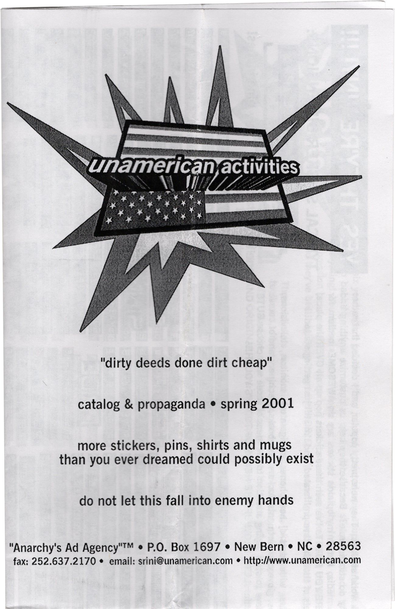 Original Spring 2001 sticker catalog, flyer, contact sheet, and five stickers from Unamerican Activities