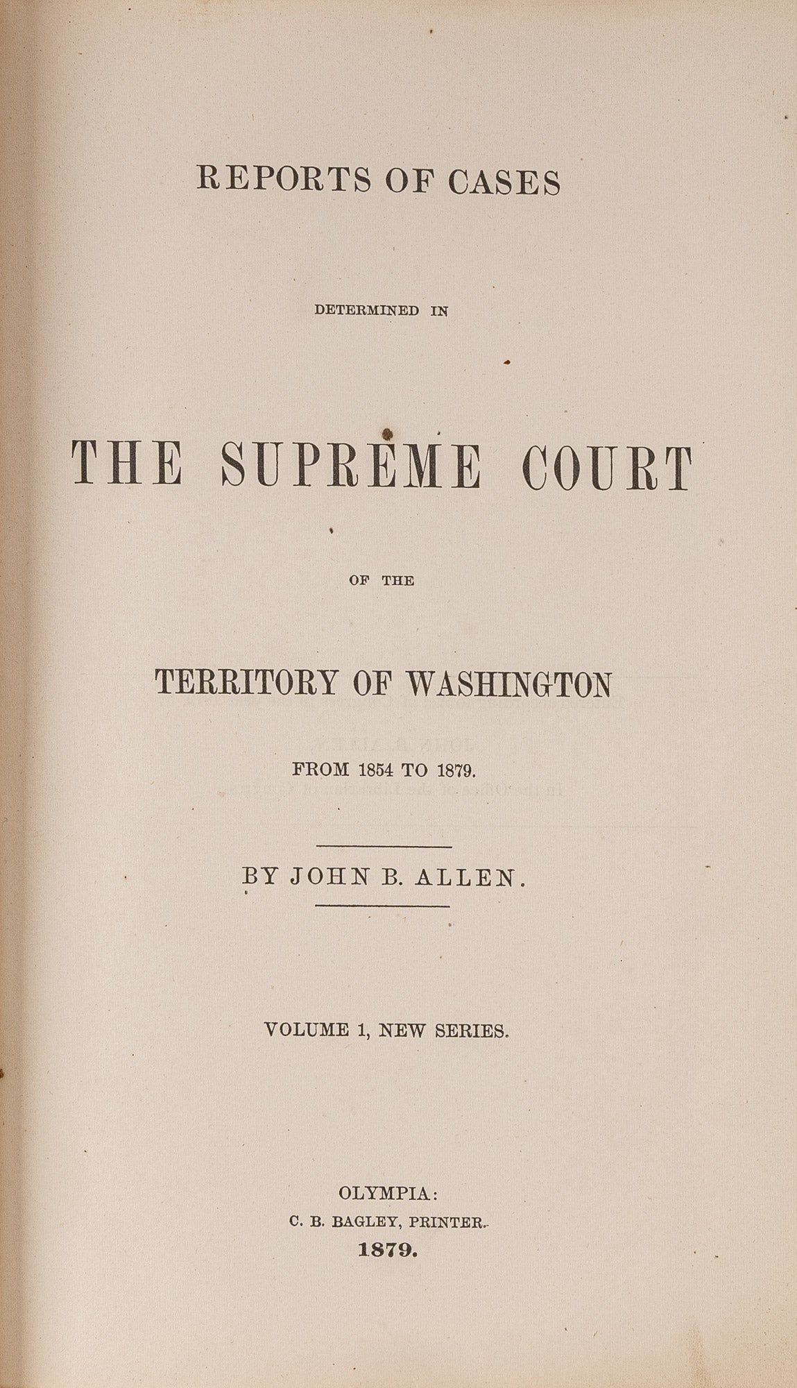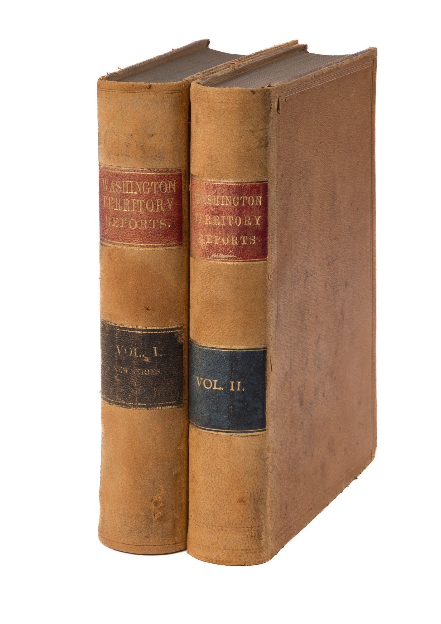 1886. New series. Vols 1 to 2 of 3 volumes.. New series. Vols 1 to 2 of 3 volumes. Allen, John B. Reports of Cases Determined in the Supreme Court of the Territory of Washington: From 1854 to 1886. Olympia: C.B. Bagley, 1879; San Francisco: Bancroft-Whitney, 1886. New series. Volumes 1 to 2 of 3 volumes. Contemporary law sheep with red and black lettering pieces to spines. Blind frames to boards. Worn and scuffed. Previous owner's signature to front covers. Second previous owner's signature to front free endpapers. Bookseller's ticket "Geo H. White/ Tumwater, WT" to front pastedown of volume one. Some offsetting to edges of endleaves, otherwise internally clean. A good set. $50. * New series. Volumes 1 to 2 of 3 volumes. Imprint of WA copy varies: Vol. 1 published in Olympia, WA by C.B. Bagley; vol. 2 and vol. 3 published in San Francisco by Bancroft-Whitney in 1886 and 1889, respectively.