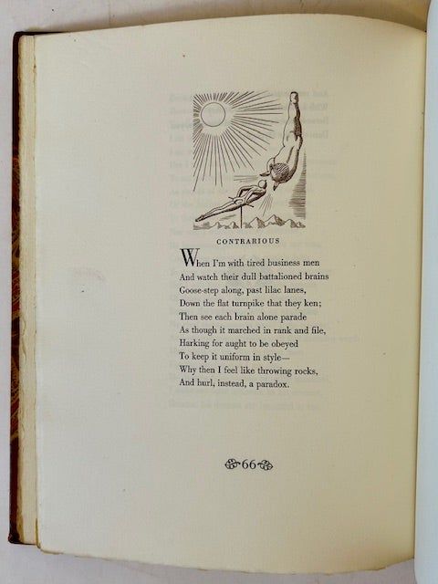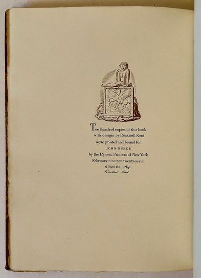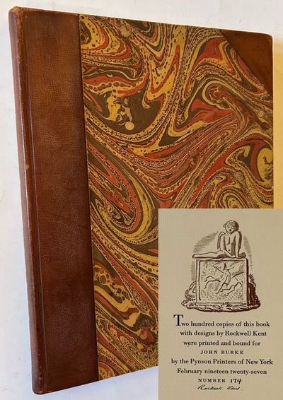 The Pynson Printers Inc, 1927. 1/4 leather. Very Good +. Rockwell Kent. A handsome copy of this 1927 Rockwell Kent-illustrated book of verse. #174 OF 200 COPIES SIGNED BY ROCKWELL KENT at the limitation page. Tight and VG+ in its 1/4 leather over marbled boards, with lovely decorative endshets and pastedowns. Very light wear at the tips and the spine ends, otherwise crisp as could be. Internally immaculate as well, with no writing or markings of any kind. Quarto, deckled fore and bottom-edges.