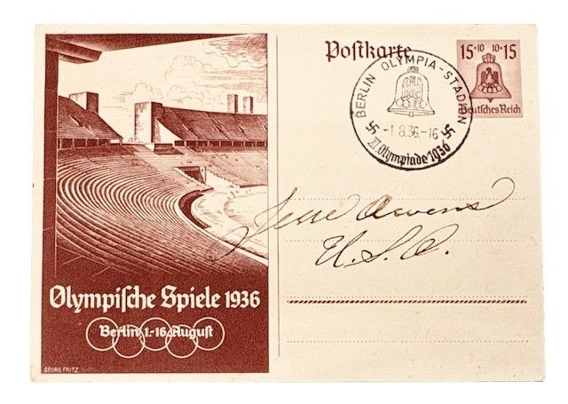 [Postcard] Postkarte with clearly readable circular postmark "Berlin Olympic Stadium XI Olympiade 1936 and "1. 8. 36._16" bookended by two small swastikas. Signed by Owens in ink on front "Jesse Owens U.S.A.