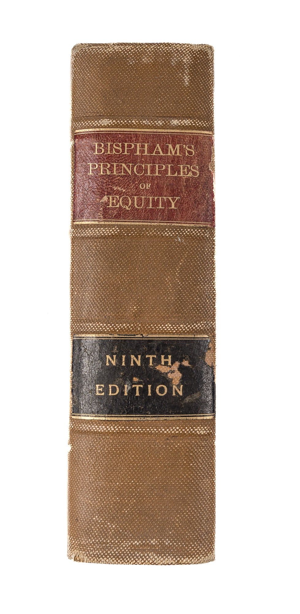 1920. Bispham, Geo. Tucker, [1838-1906]. McCoy, Joseph D[egu], Editor. The Principles of Equity: A Treatise on the System of Justice Administered in Courts of Chancery. Ninth Edition. New York, Banks law Pub. Co., 1920. cixxx, 910 pp. Library buckram with red and black gilt stamped lettering pieces to spine. Spine and boards worn. Previous owner's signature to front pastedown. Some color markings to front free endpaper, otherwise internally clean. A good copy. $25. * Ninth Edition.