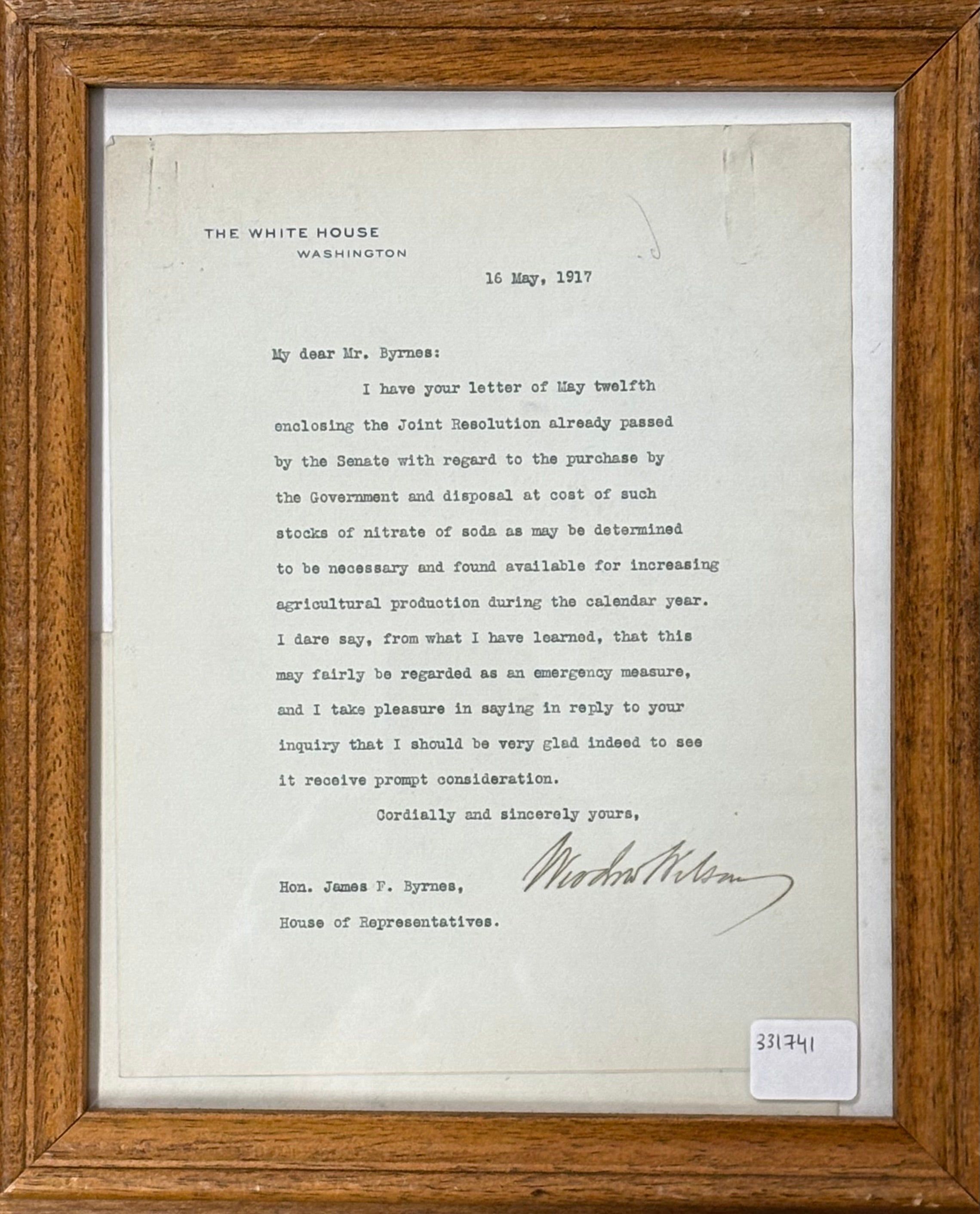 1917. framed. very good. Autographed letter from President Woodrow Wilson to James F. Byrnes, congressman from South Carolina. The letter written on White House stationary, is in regards to stocks of nitrate of soda and the need for increased agricultural production. Written in May of 1917 about a month after the U.S. entered WWI. Please inquire for more information.