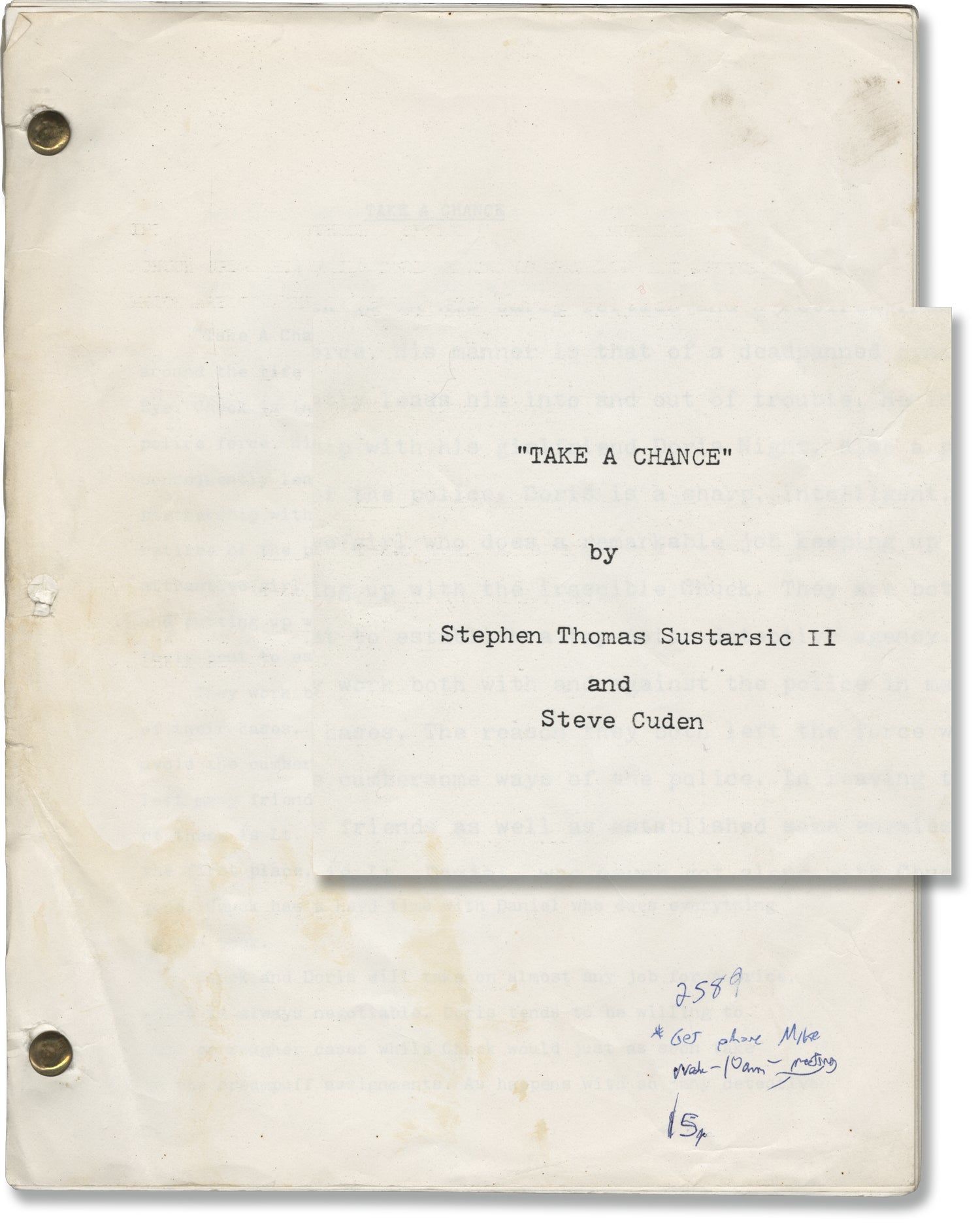 Front wrapper integral with title page, with credits for screenwriters Stephen Thomas Sustarsic II and Steve Cuden. 60 leaves, with last page of text numbered 54. Xerographic duplication, rectos only. Pages Very Good plus, with light soiling to the title page, bound with two gold brads.