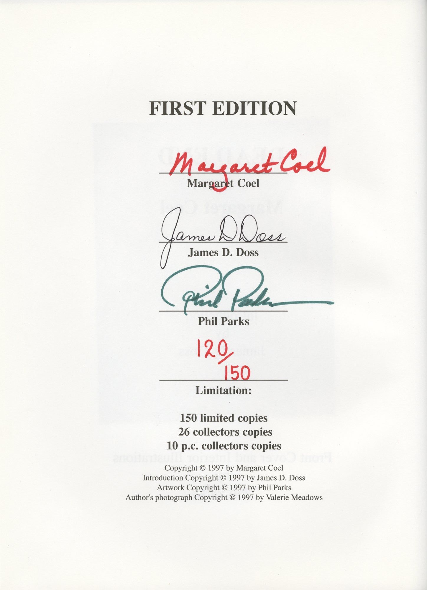 Royal Oak, MI: A.S.A.P., 1997. Limited Edition, one of 150 hand-numbered copies (this being No. 120) SIGNED by author Margaret Coel, artist Phil Parks, and James D. Doss, who wrote the introduction.