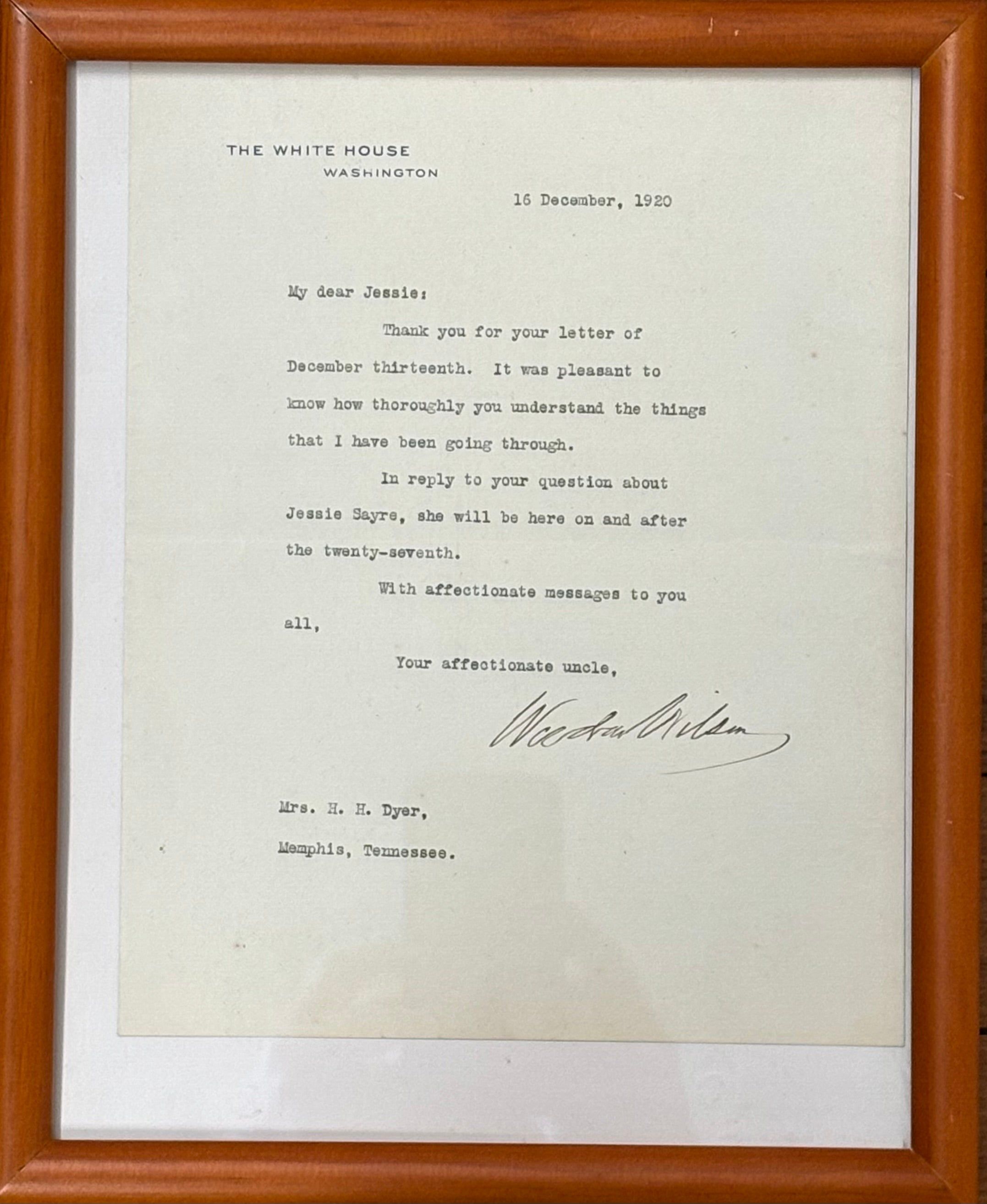 1920. framed. very good. Typed letter written on White House stationary, from President Woodrow Wilson to his niece. Written in 1920 and signed by Wilson on the bottom. Please inquire for more information.