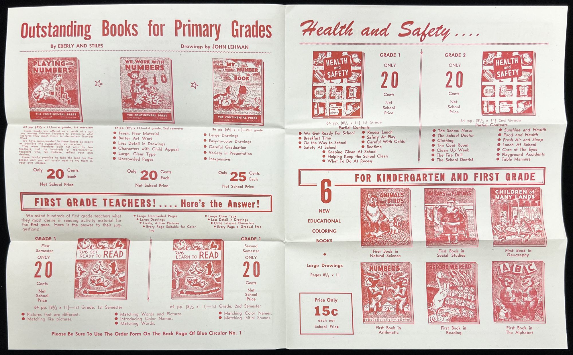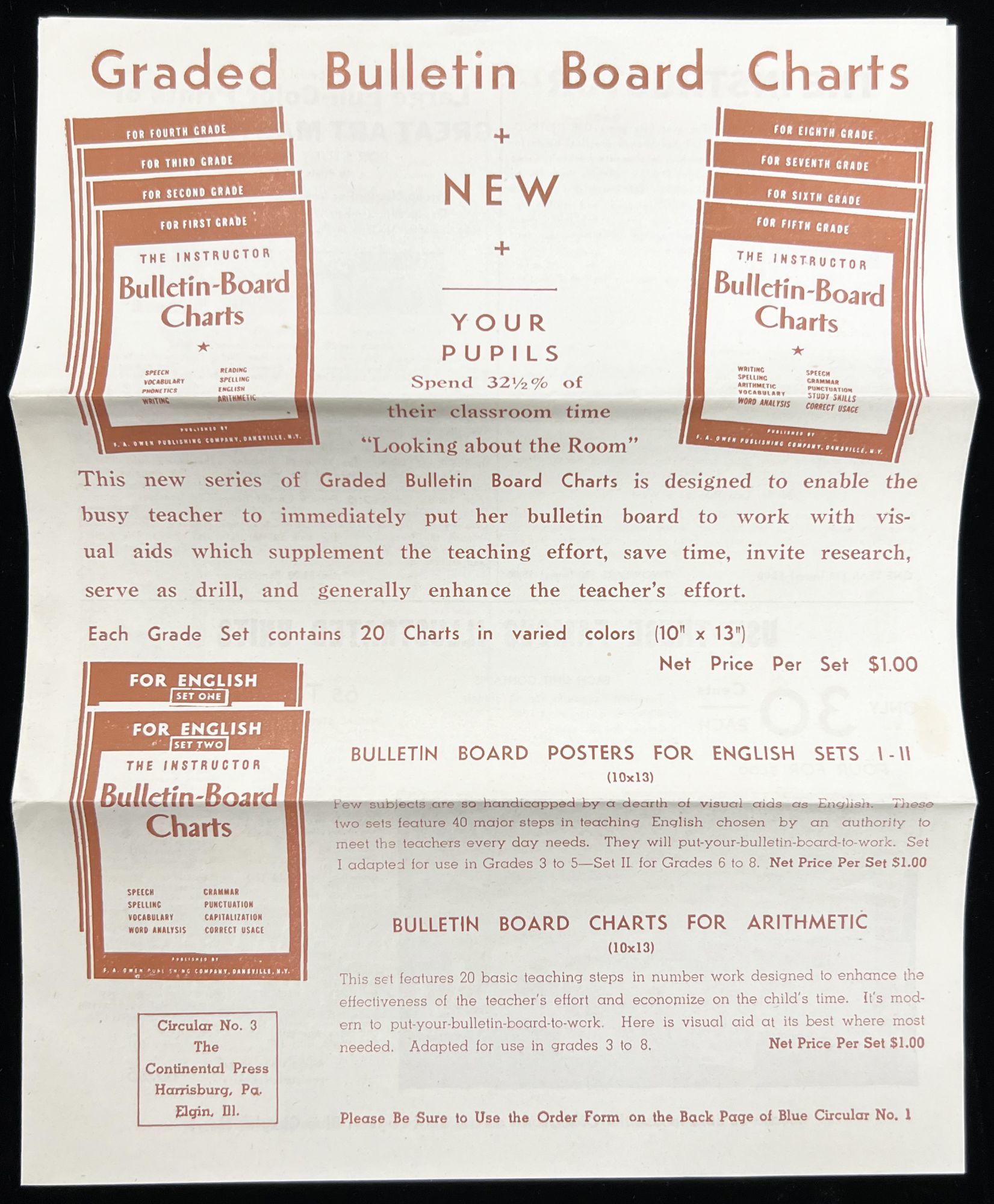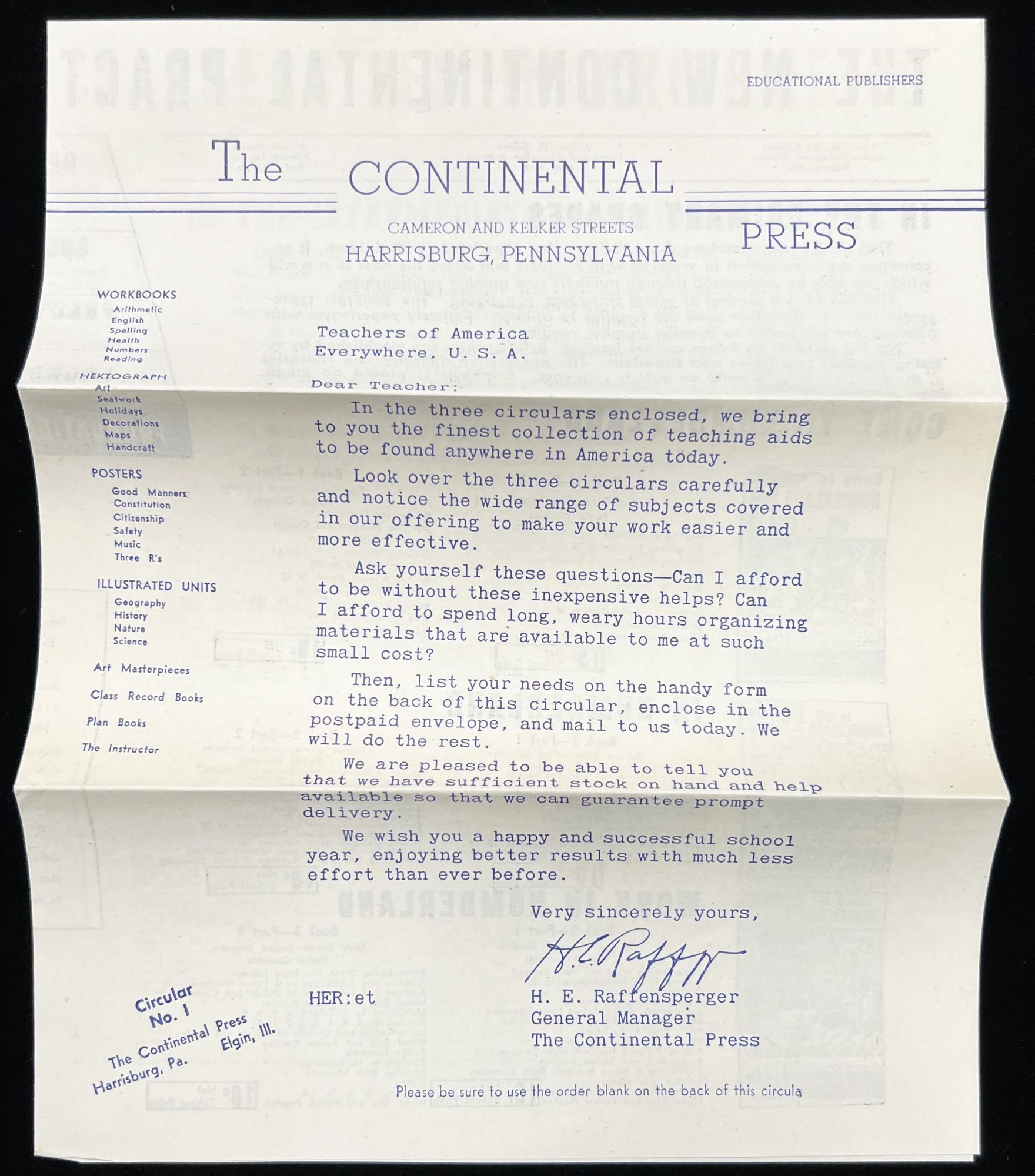 Harrisburg, Pennsylvania: The Continental Press, 1944. Very good. Letter folds, toning to envelope.. A set of three (3) advertising circulars sent to a third grade teacher from the Continental Press in the 1940s, providing us today with detailed insight into what material was being published for the classroom c.1944. Each of the circulars measures approx. 11" by 8.5", and includes lists of textbooks and workbooks for sale by the publisher with prices and several illustrations of the publisher's bindings. Also include brief pitches and descriptions of pedagogical aims. The second leaf of the first circular doubles as an order blank, with options for ordering materials in the following subjects: Arithmetic; English; Primary/early education; educational coloring books; Spelling; Health; Record and Plan Books; Bulletin Board charts; and miscellaneous ephemera such as room decorations, maps, and hand craft activities. Also includes 3.5" by 6" business reply envelope and the original addressed 4" by 8.75" envelope the materials were sent in.