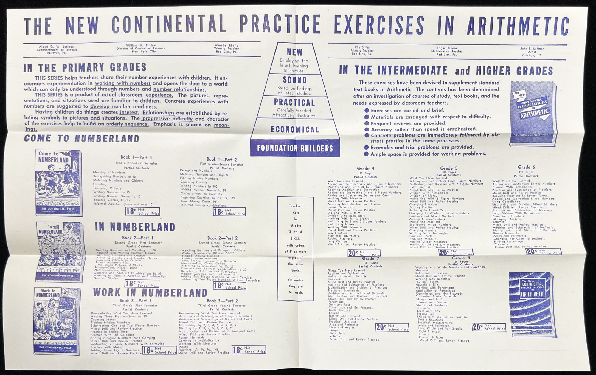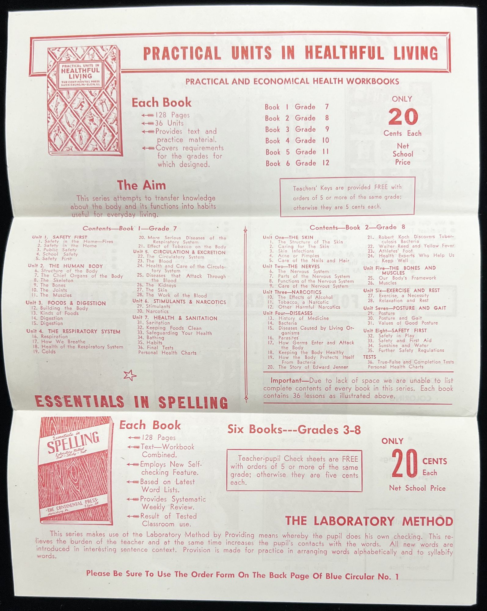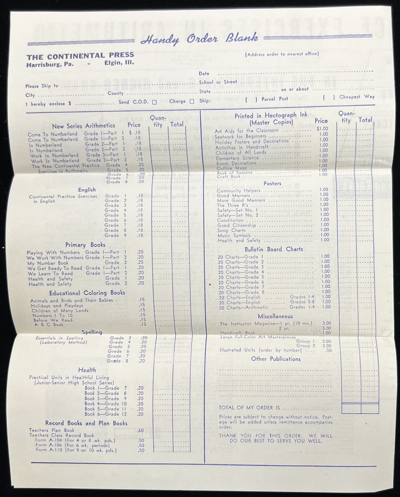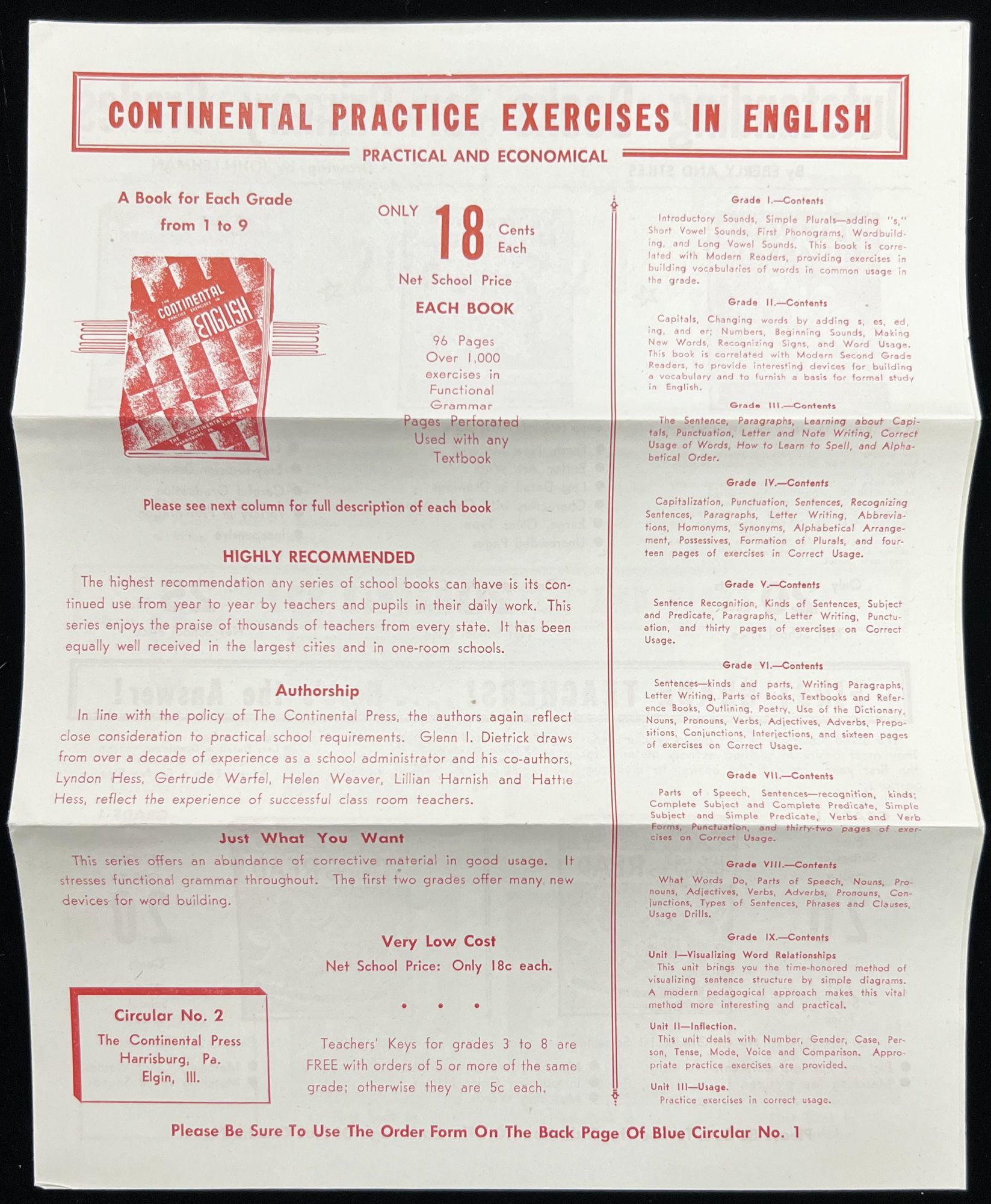 Harrisburg, Pennsylvania: The Continental Press, 1944. Very good. Letter folds, toning to envelope.. A set of three (3) advertising circulars sent to a third grade teacher from the Continental Press in the 1940s, providing us today with detailed insight into what material was being published for the classroom c.1944. Each of the circulars measures approx. 11" by 8.5", and includes lists of textbooks and workbooks for sale by the publisher with prices and several illustrations of the publisher's bindings. Also include brief pitches and descriptions of pedagogical aims. The second leaf of the first circular doubles as an order blank, with options for ordering materials in the following subjects: Arithmetic; English; Primary/early education; educational coloring books; Spelling; Health; Record and Plan Books; Bulletin Board charts; and miscellaneous ephemera such as room decorations, maps, and hand craft activities. Also includes 3.5" by 6" business reply envelope and the original addressed 4" by 8.75" envelope the materials were sent in.