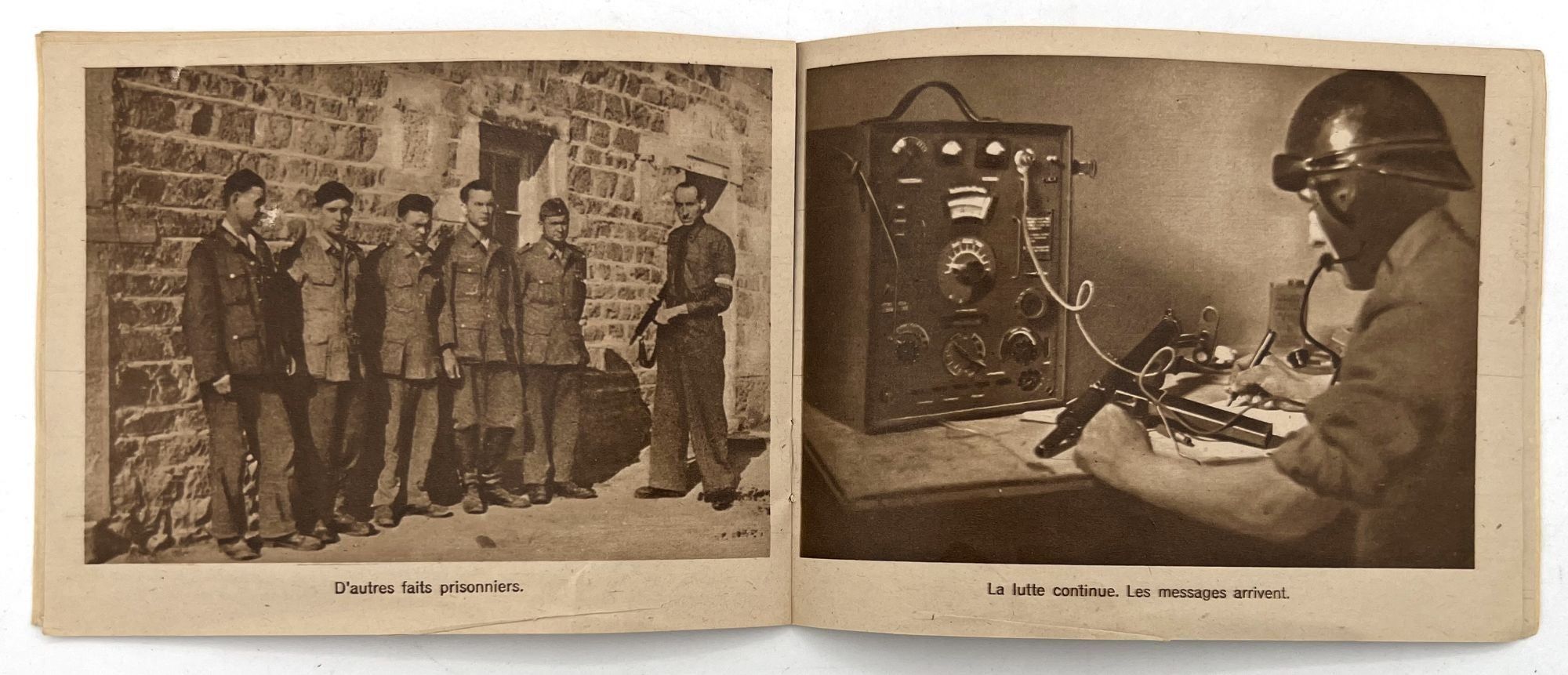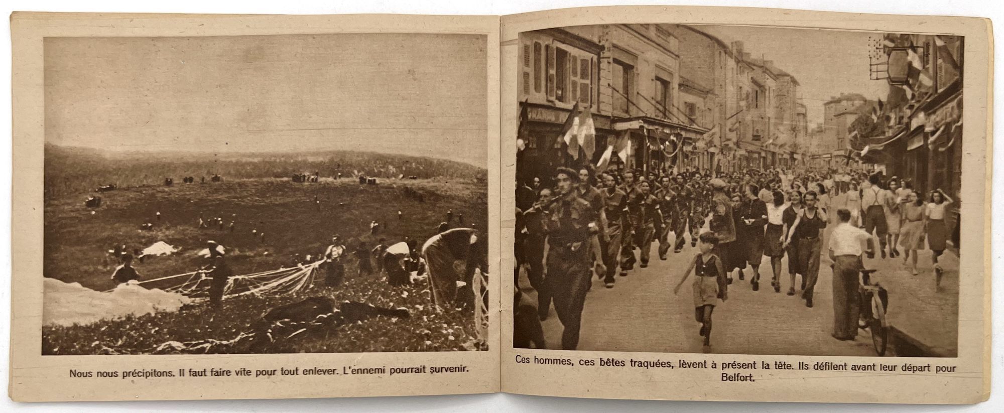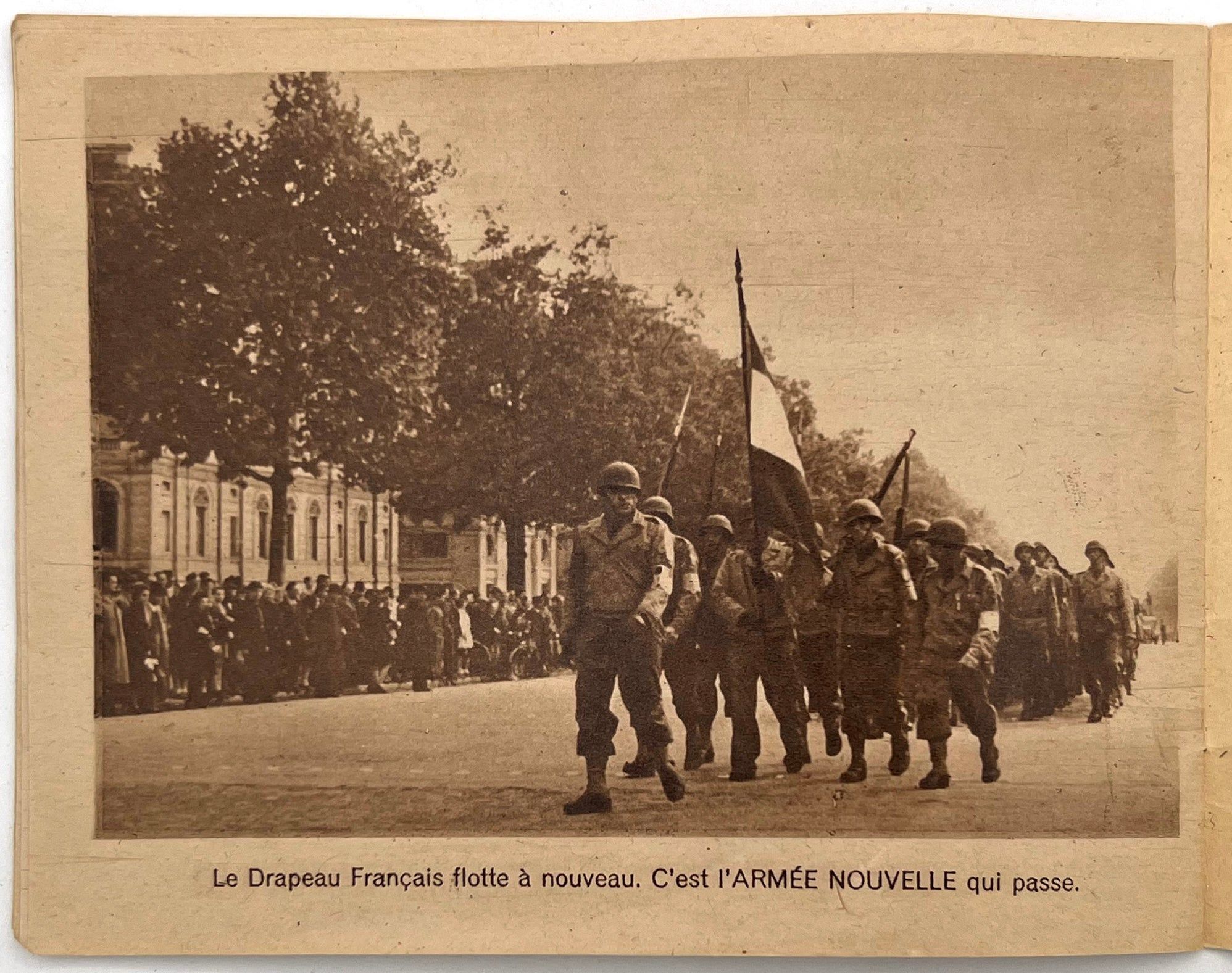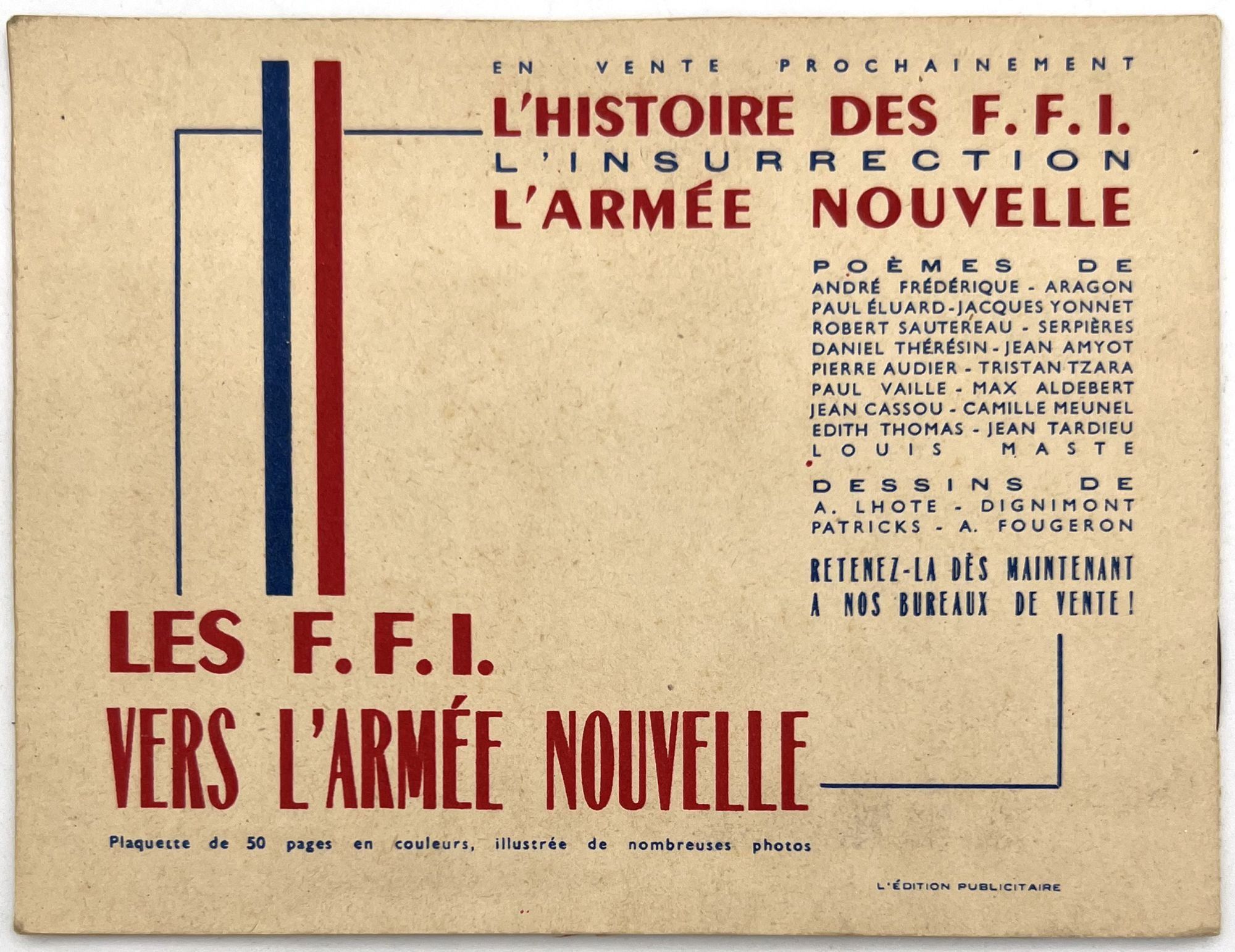 France, 1944. Very good. Light toning, dust soiling, minor staining from staples.. A printed photo booklet promoting the F.F.I., or "French Forces of the Interior" (in French: "Forces françaises de l'Intérieur"). The F.F.I. was the formal name given by Charles de Gaulle to unified paramilitary resistance groups in 1944. Includes full-page photo reproductions of the forces resisting the enemy, each with a brief caption. Subjects of the photographs include: a train derailed to prevent German forces from advancing; prisoners of war; graphic photos of the enemy fallen on the battlefield; messages being recorded; a parade of proud civilians marching before going to liberate Belfort; and members of the F.F.I. holding a French flag proudly. Single vol. (4.75" by 6"), pp. [16], photo illus., stapled in original illus. wrps with image of French soldiers superimposed over a stylized French flag on the front. Includes advertisement for upcoming F.F.I. publication on lower wrapper.