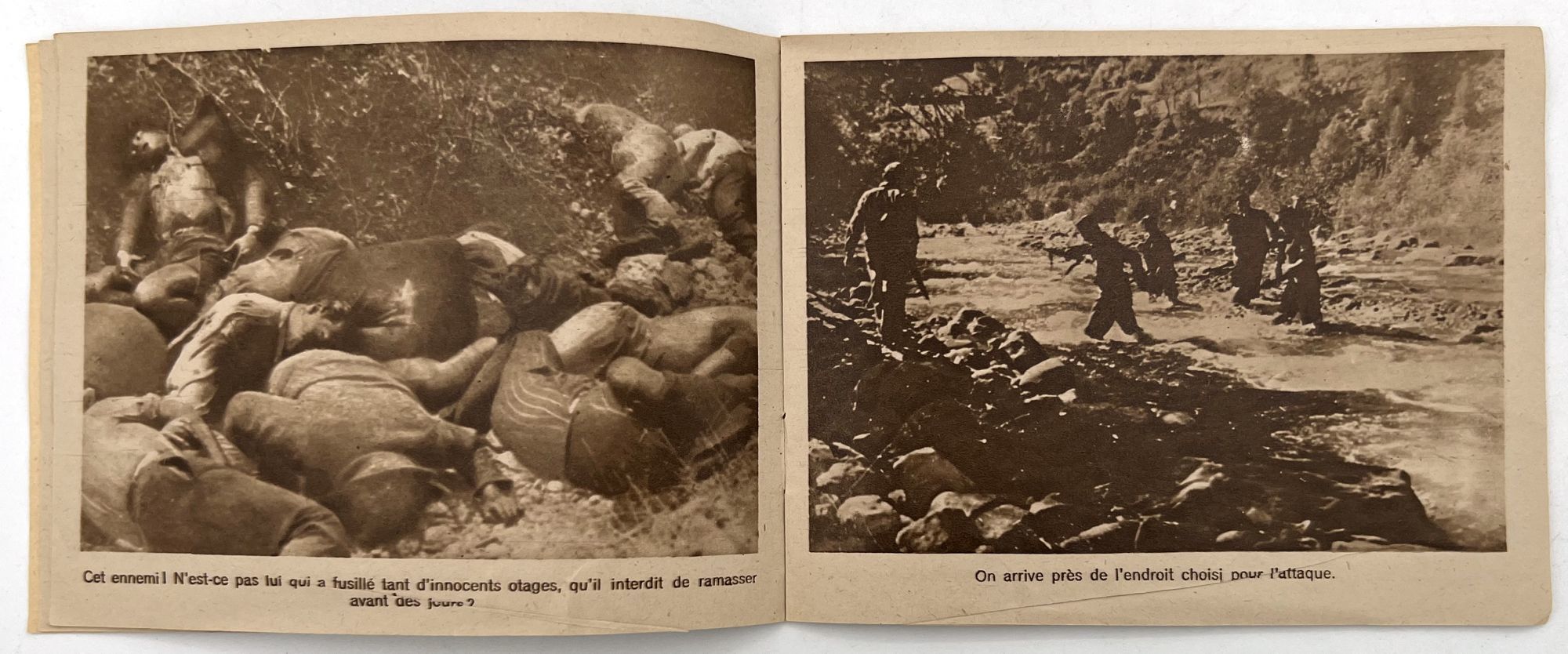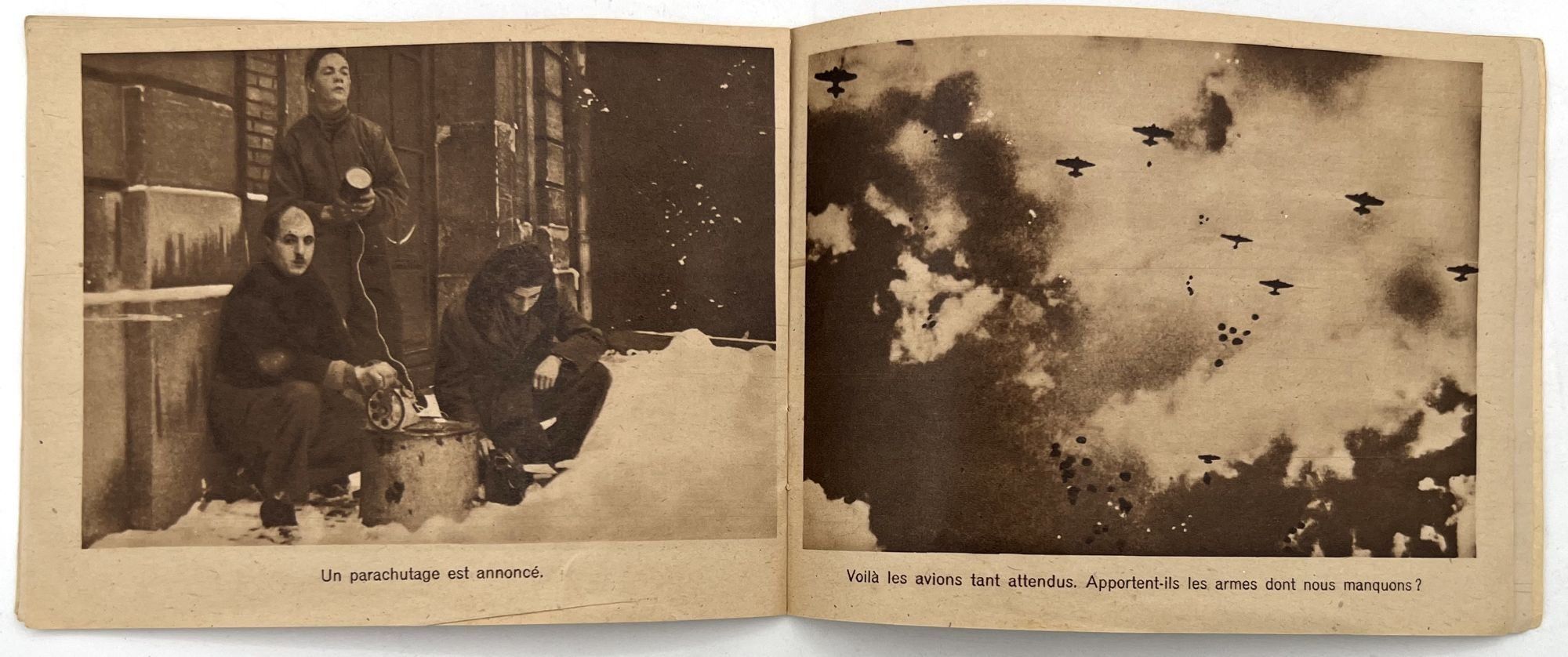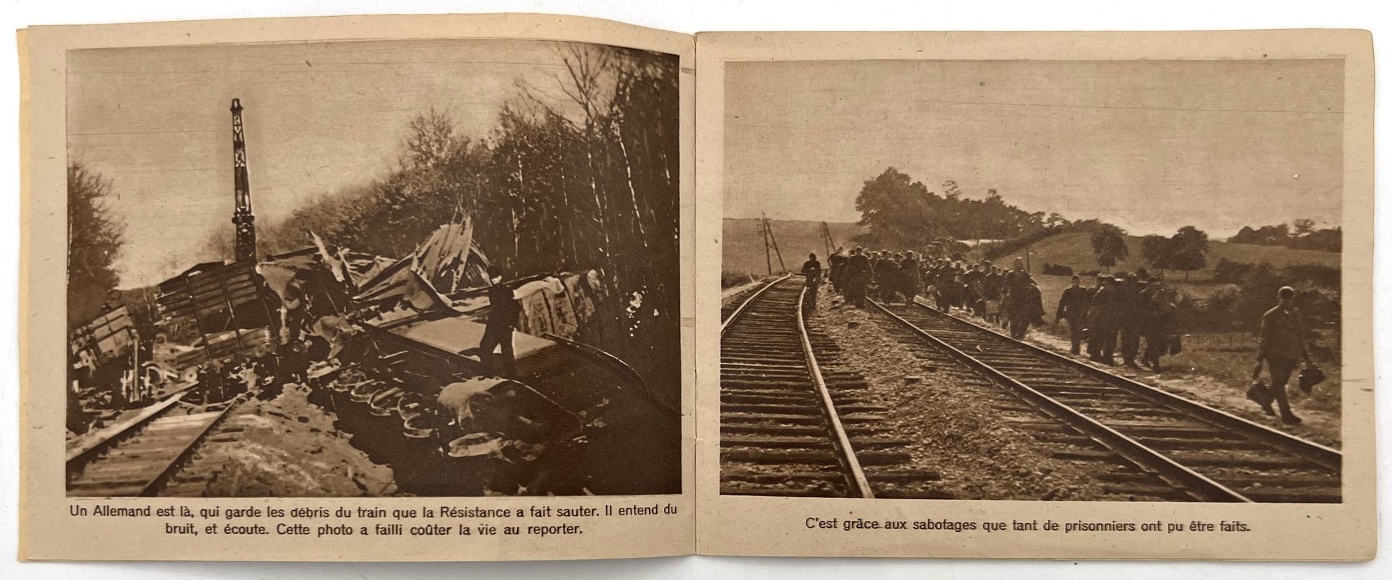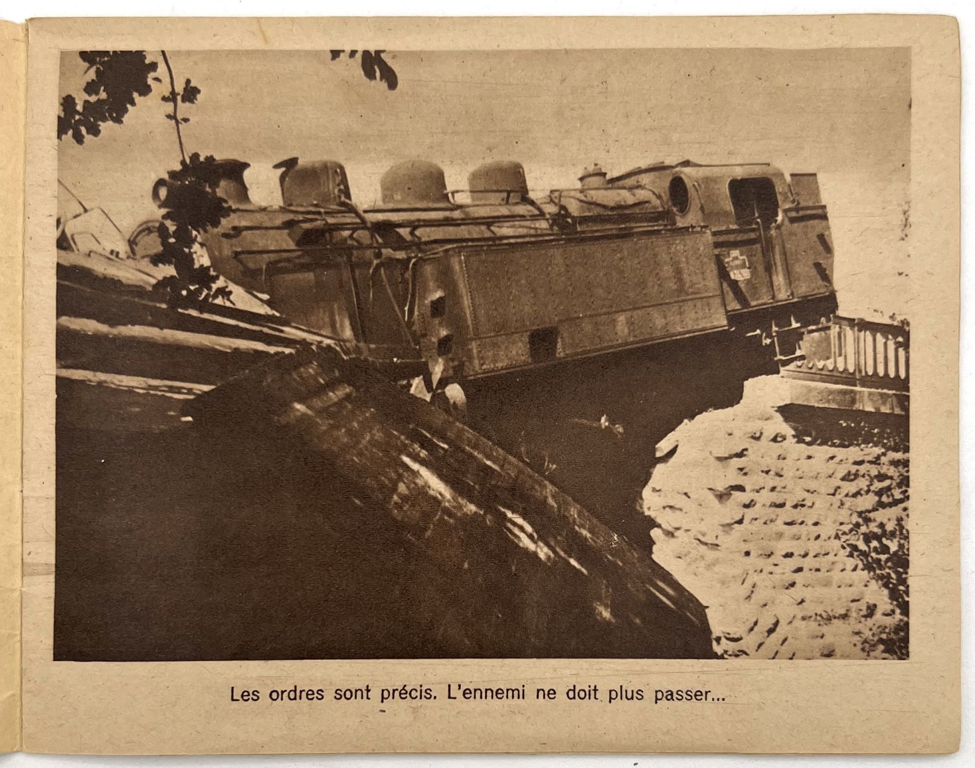 France, 1944. Very good. Light toning, dust soiling, minor staining from staples.. A printed photo booklet promoting the F.F.I., or "French Forces of the Interior" (in French: "Forces françaises de l'Intérieur"). The F.F.I. was the formal name given by Charles de Gaulle to unified paramilitary resistance groups in 1944. Includes full-page photo reproductions of the forces resisting the enemy, each with a brief caption. Subjects of the photographs include: a train derailed to prevent German forces from advancing; prisoners of war; graphic photos of the enemy fallen on the battlefield; messages being recorded; a parade of proud civilians marching before going to liberate Belfort; and members of the F.F.I. holding a French flag proudly. Single vol. (4.75" by 6"), pp. [16], photo illus., stapled in original illus. wrps with image of French soldiers superimposed over a stylized French flag on the front. Includes advertisement for upcoming F.F.I. publication on lower wrapper.