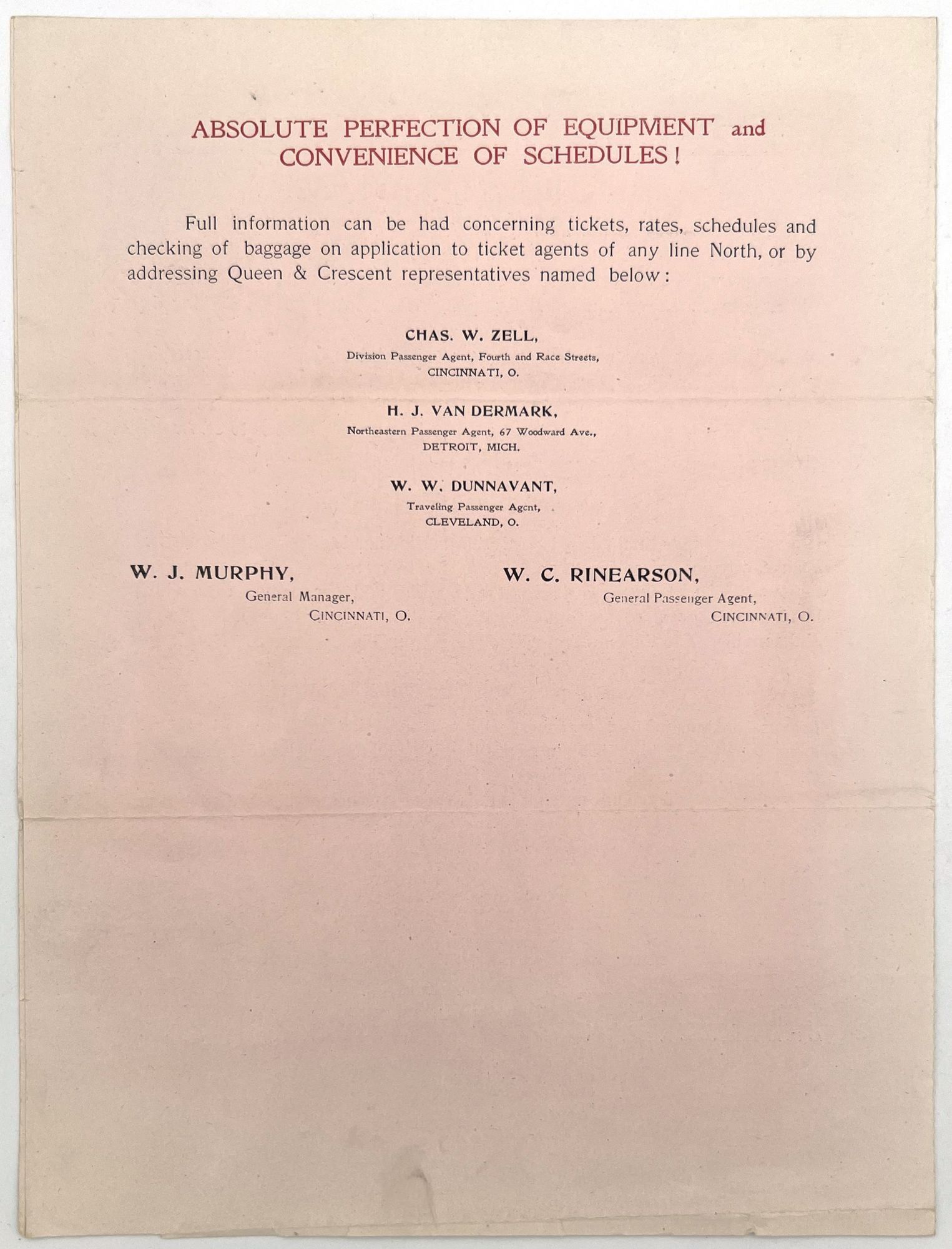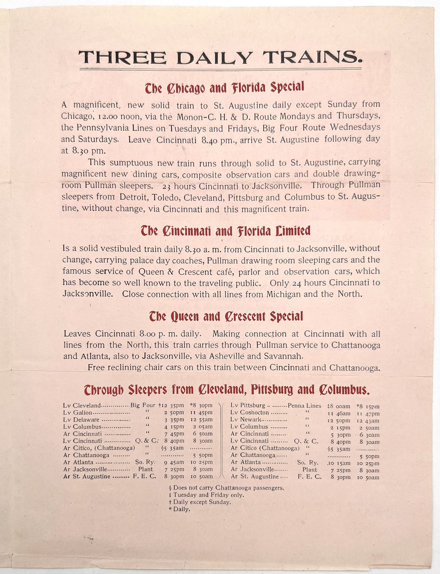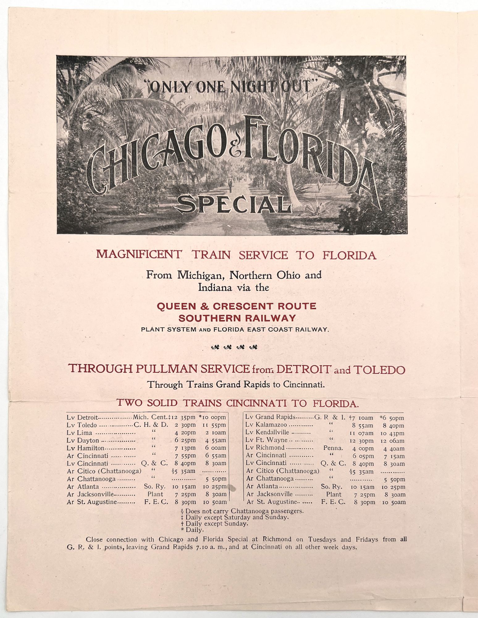 n.pl: Southern Railway, 1926. Good. Letter folds, sunning.. Printed circular advertising a "magnificent" overnight train journey to Florida from Michigan, Northern Ohio and Indiana via the "Queen & Crescent Route". Includes time tables, a brief pitch for the railway's luxurious accommodations, an a photo of the tropical Florida scenery. Printed in red and black on pink paper bifolium (11" by 8").