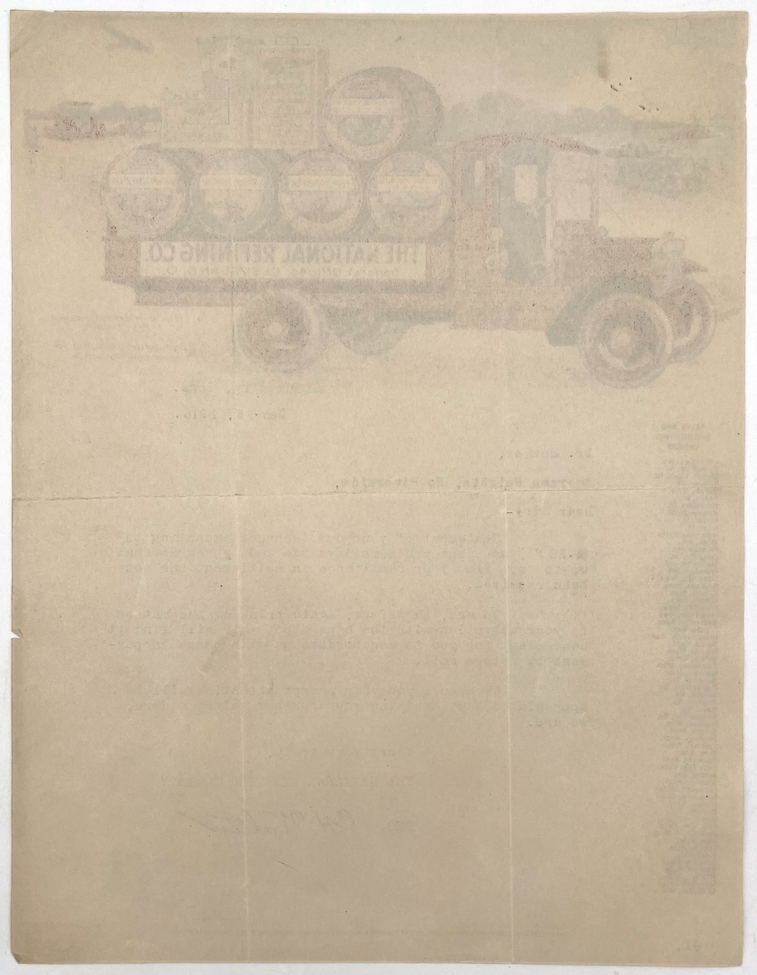 Cleveland, Ohio: The National Refining Co, 1916. Very good. Light toning, a couple nicks, letter folds.. Typewritten letter on illustrated letterhead promoting the National Refining Co. of Cleveland. The illustration at the head is large and colorful, depicting a large red pickup truck carrying barrels of the company's various products (e.g. gasoline, transmission grease, light oil, valve oil). The letter addresses a customer with an outstanding balance, requesting settlement, and has been signed via an ink stamp. Includes a list of offices on the left-hand edge. Measures approx. 10.75" by 8.5", verso blank. Includes an interesting disclaimer printed at the foot: "All agreements are contingent upon strikes, accidents, fires and other causes unavoidable or beyond our control
