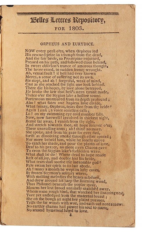 An advertisement on the recto of the final leaf states: "This is the third Belles-Lettres-Repository. The two former have been done at the expense of the Publisher,..... this he hopes will be at the expense of lovers of neat things." At the bottom of the same page are descriptions of the plates and illustrations, including the "frontispiece title-page [i.e. front wrapper] L'Allegro, and finishing piece Il Penseroso, form the cover" and the plate on the inside front wrapper being "Orpheus, Eurydice and Cerberus." The vignettes by Maverick illustrate "select passages in Hayley's 'Triumphs of temper' with extracts underneath each. At the foot of each of these pages, are the kalendar [sic] pages for 1803, and the intermediate spaces are ruled for belles-lettres selections &c. .... these alternate with twelve other vignettes architectural and picturesque, with ruled memorandum pages under each, the whole engraved."