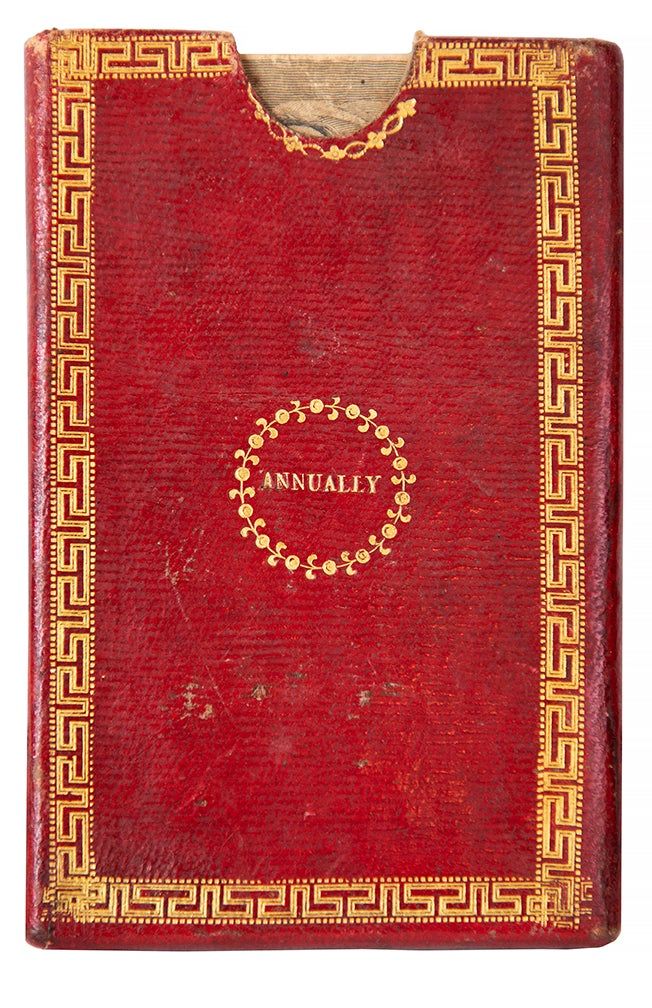 New York: D. Longworth at the Shakespeare Gallery, 1803. 24 engraved vignette illustrations by Peter Maverick. 5-80, [2]pp, with the calendar and memorandum pages (i.e. pp. 41-64) engraved. 12mo. Original wrappers, each comprised of two plates backed onto each other (i.e. 4 plates in total), engraved by Anderson. Publisher's red morocco gilt slipcase. 24 engraved vignette illustrations by Peter Maverick. 5-80, [2]pp, with the calendar and memorandum pages (i.e. pp. 41-64) engraved. 12mo. As least three issues of Longworth's Belles Lettres Repository were published, for 1801-1803, with slightly varying titles: The American ladies & gentlemen's pocket almanac and elegant belles lettres repository... for 1801 (Evans 36816); The American ladies' & gentlemen's pocket almanac and belles lettres repository for 1802 (Shaw & Shoemaker 50194); and the present, titled at the bottom of the front wrapper and as a caption title at the head of p. 5.