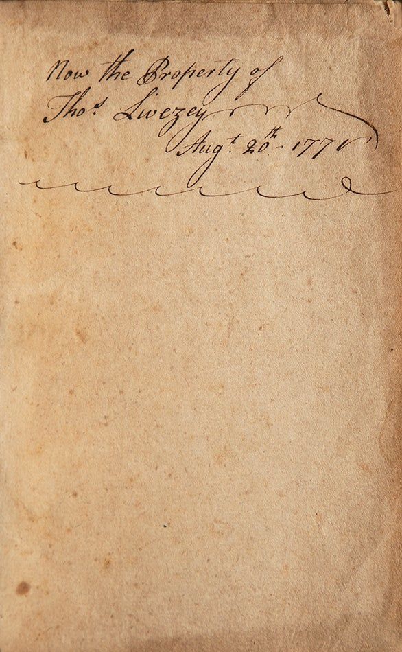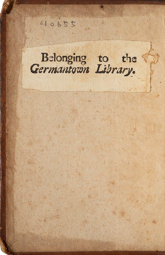 The present volume includes mid-eighteenth century provenance to the Germantown Library Company, founded in 1745 as the first such Pennsylvania company among non-English speaking settlers. Lamberton, Colonial Libraries of Pennsylvania notes that advertisements for the company cease around 1771, when it likely folded and the collection dispersed. Indeed, on the facing leaf to the Germantown label is a 1771 inscription by Thomas Livezny (1722-1790), owner of a grist mill on Wissahickon Creek, said to be the largest in the colonies, member of the Assembly from Philadelphia County in 1765, member of the Committee of Correspondence and Franklin correspondent. Evans 965; Wing W2298; ESTC W28221