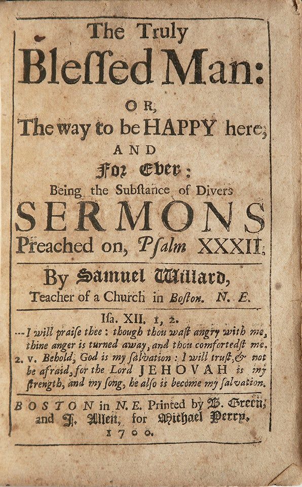 Boston: B. Green and J. Allen for Michael Perry, 1700. 652, [4]pp. 8vo. Early panelled calf, repairs to joints. Provenance: Germantown Library Company (printed label); Thomas Livezey (signatures and inscription dated 1771). 652, [4]pp. 8vo. Willard was one of the most prolific of early American authors. This collection of excerpts from Willard's sermons tackles the question of happiness as well as related problems of guilt, forgiveness, righteousness, and rejoicing: "[Undone men's] insatiable desires push them forward in quest of felicity, and their crazed and deluded understandings, which call good evil, and evil good, point them to Objects that are empty and courses that will undo them."