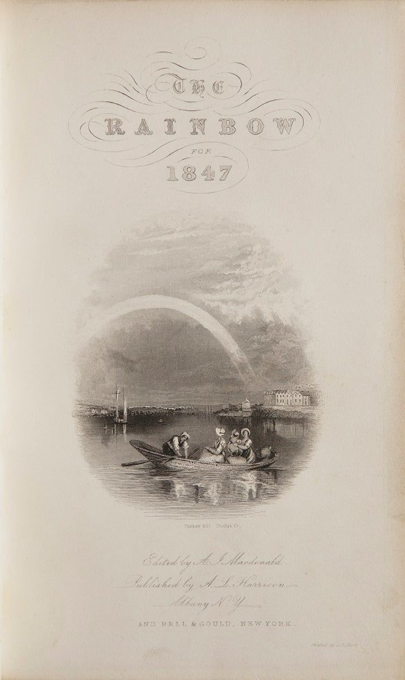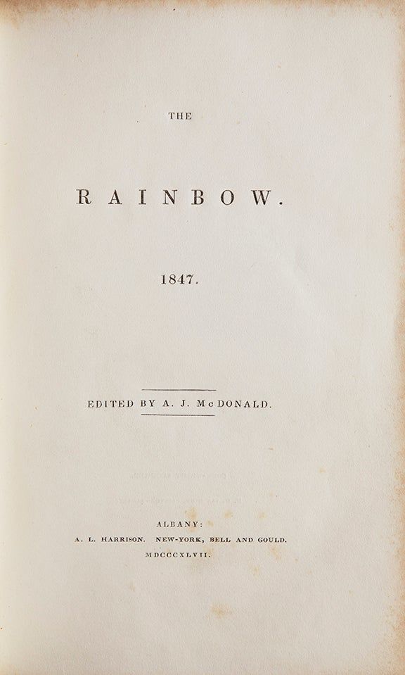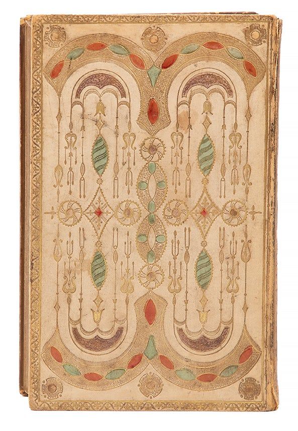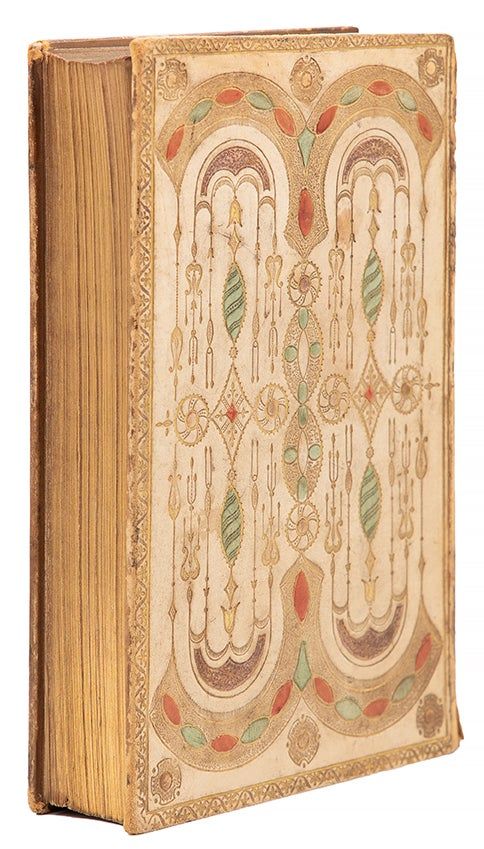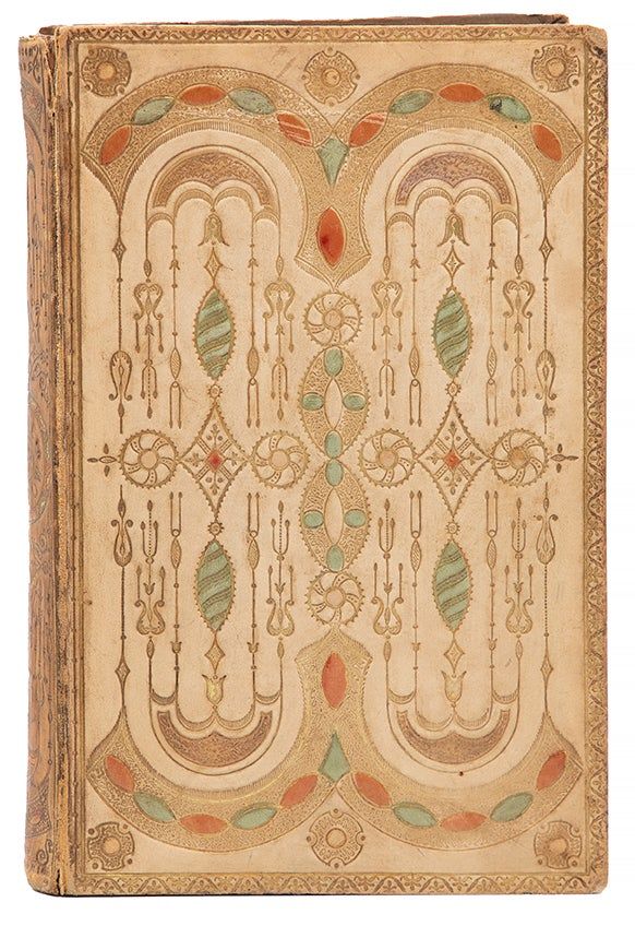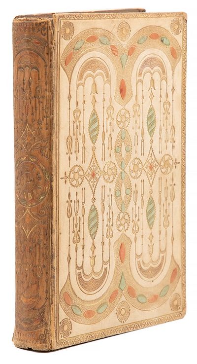 Albany, New York: A.L. Harrison. New-York, Bell and Gould, 1847. First edition, first state. Engraved title-page and 9 engraved plates. viii, [i], 272 pp. 8vo. Publisher's cream calf, covers blocked in gilt, stencilled ornaments in green, red and brown paint in imitation of colored onlays, spine with circular black onlay stamped “1847”, spine ends stamped in gilt, “A.L. Harrison, Binders. Patent Stereographic Binding,” a.e.g, glazed decorative endpapers, light toning to spine, minor wear at top of spine. Provenance: Anthony David Estill (booklabel). Housed in a cloth box. First edition, first state. Engraved title-page and 9 engraved plates. viii, [i], 272 pp. 8vo. A publisher’s-bound gift book collecting works of William Gilmore Simms, Park Benjamin, James T. Fields and others. “The Rainbow” was first published in 1847 (as here) with the remainders being reissued again the following year with all the dates cleverly changed to read 1848 (BAL’s second state). The publisher’s binding, produced by A.L. Harrison’s “Patent Stereographic” process, involves the mechanical application of paint to mimic the look of colored onlays. The light colored calf is generally susceptible to discoloration. The present example is the nicest we have ever handled. BAL 1027; Faxon 676; Maser, Bookbinding in America 47 (“This binding is unusally successful from a technical point of view”); Andrews, Bibliopegy in the United States, p. 116; Miller, Books Will Speak Plain p. 195 Fig. 4.13b-d