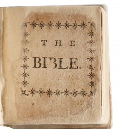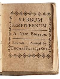Boston: Printed by Thomas Fleet, 1802. The tenth American thumb Bible. Separate title pages to each work. With three wood or metal cuts in N.T. [10],13-160; vi, 107, [2], ii-iv, iv pp. 1 vols. Miniature (2-1/16 x 3-1/4 inches), in 12s. Dappled tan pastepaper over wooden boards. Leaf A1 in OT supplied and remargined. The tenth American thumb Bible. Separate title pages to each work. With three wood or metal cuts in N.T. [10],13-160; vi, 107, [2], ii-iv, iv pp. 1 vols. Miniature (2-1/16 x 3-1/4 inches), in 12s. A splendid copy of the miniature Bible printed by Thomas Fleet in 1801-2, the tenth American thumb Bible. The text is a paraphrase of the Old and New Testaments by John Taylor (1578-1653), known as the Water Poet; the earliest surviving edition of which was printed in London in 1614. In America, five editions were printed in the 1760s, and four more between 1786 and 1799. All are rare and survive in just a few copies. After about 1810, the number of thumb Bibles (and the variousness of their titles and imprints) increased markedly.