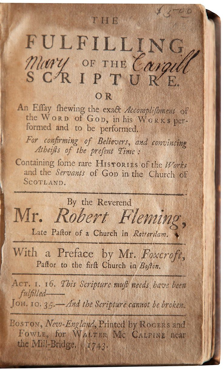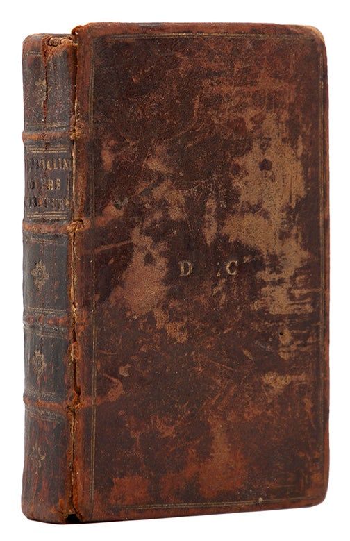 Boston: Printed by Rogers and Fowle, for Walter McAlpine near the Mill-Bridge, 1743. xxiv, xii, 522pp. 12mo. Contemporary calf, covers ruled in gilt, board edges decorated with a gilt roll tool, spine with raised bands in five compartments, lettered direct in gilt in the second compartment, the others with a repeat decoration in gilt, upper cover nearly detached, worn. Provenance: David Cargill (initials in gilt on the upper cover); Mary Cargill (signature on title); Rev. John Wright (booklabel). Housed in a cloth clamshell box. xxiv, xii, 522pp. 12mo. A very unusual early 18th century American binding, as decorated gilt spines and board edges were not generally found in America before 1750 and owner's initials in gilt virtually never seen on American bindings before the Revolution. That the binding is from the period is confirmed by the initials, as David Cargill died in 1748. See Hannah French, "Full Gilt and Extra Gilt" in Bookbinding in Early America (WorcesterL 1986), pp. 122-147. Bristol B1208; ESTC W19467