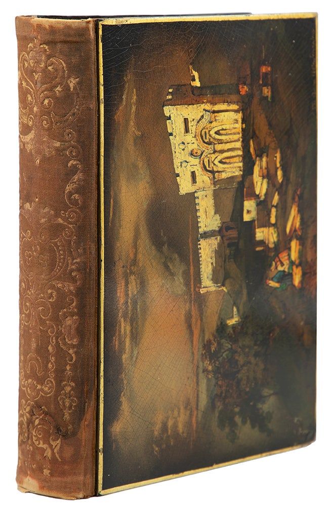 Philadelphia: J. B. Lippincott & Co, 1850. Color lithographed plates in the style of illuminated manuscript leaves, lithographed by P. S. Duval. Text within color printed borders. 680pp. 8vo. Contemporary cloth backed japanned papier maché covers, the upper cover with a painted and gilded biblical scene, titled The Golden Gate, Jerusalem, gilt edges, wear to the spine. Housed in a cloth clamshell box. Color lithographed plates in the style of illuminated manuscript leaves, lithographed by P. S. Duval. Text within color printed borders. 680pp. 8vo. A lovely example of a hand-painted japanned, or lacquered binding. The covers, referred to as papier maché, are more accurately comprised of many sheets of paper pressed with glue and starch between the layers and then oven-dried to form boards which could be sanded or otherwise treated as wood. After painting, multuple layers of varnish are applied, with the gilt added to the wet varnish.