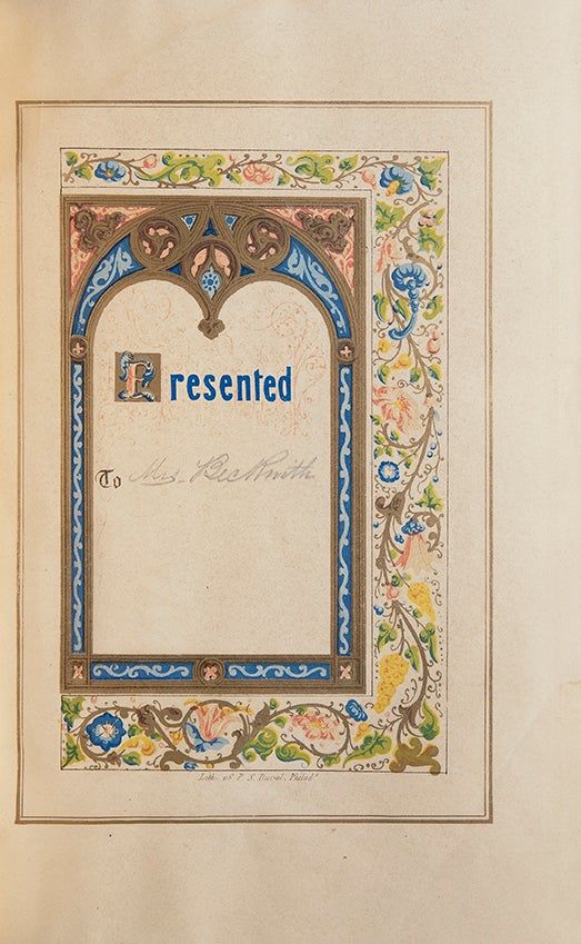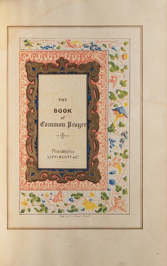 - Color lithographed plates in the style of illuminated manuscript leaves, lithographed by P. S. Duval. Text within color printed