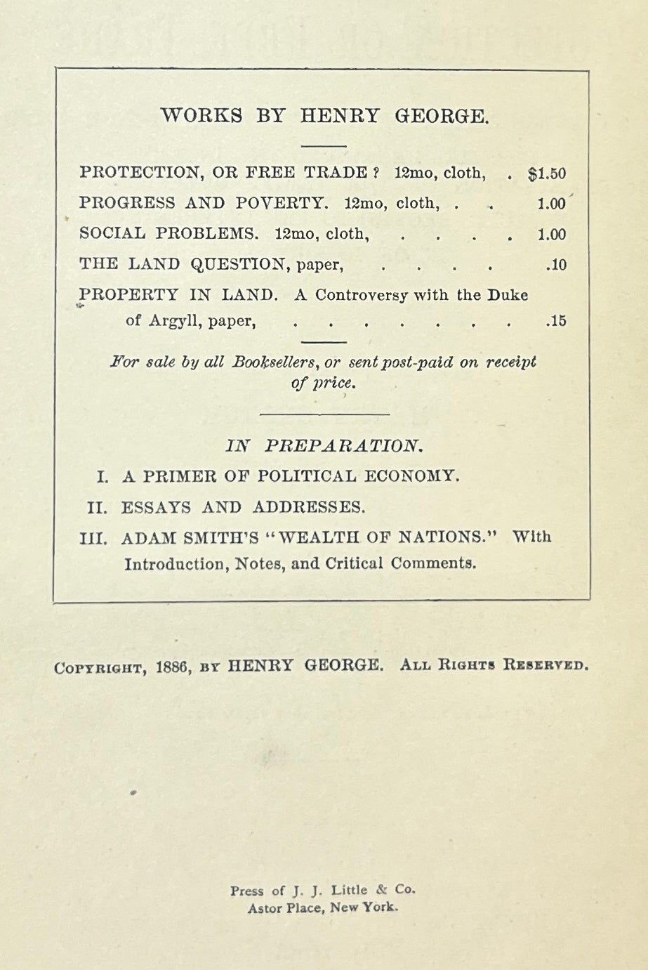 New York: Henry George & Co, 1886. First Edition. Hardcover. Good. Good. Red cloth, generally rubbed, some scuffs and stains, with gilt lettering on the spine. Square and firmly bound, a tidemark at the bottom-right corner of the text block, clean internally. The economist's work in which he "endeavored to determine whether protection or free trade better accords with the interests of labor, and to bring to a common conclusion on this subject those who really desire to raise wages.