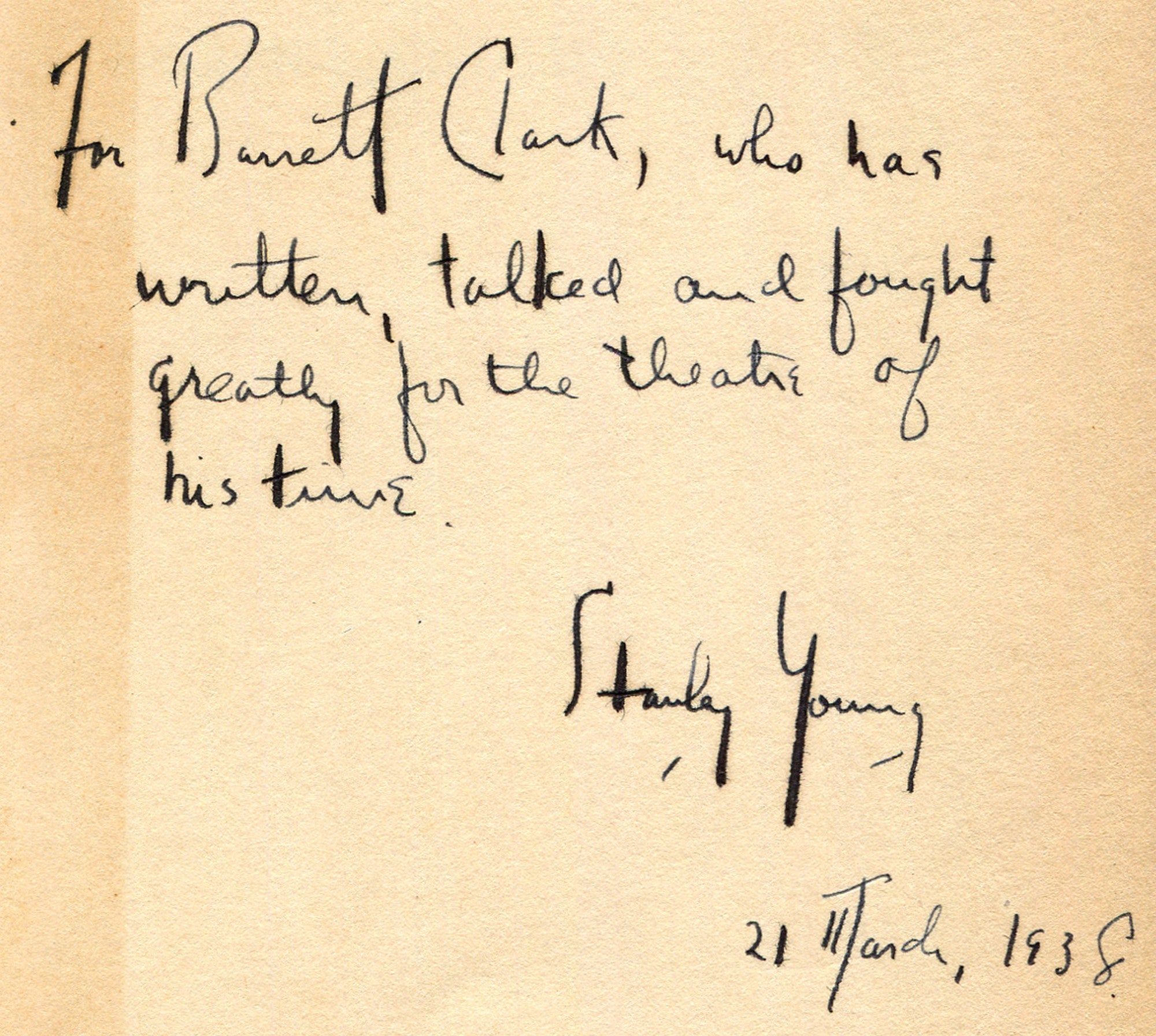 New York: Farrar & Rinehart, 1938. Hardcover. Near Fine/Very Good. First edition. Endpapers discolored, mostly from binder's glue bleed through, very good in very good dust jacket, toned at the spine, and with other light wear. A nice presentable copy. Inscribed by the author: "For Barrett Clark, who has written, talked and fought greatly for the theatre of his time. Stanley Young. 21 March 1938." Barrett H. Clark was an exceptionally important figure in modern American drama: aside from authoring and translating many plays, he served as the longtime literary editor for the drama publisher Samuel French, as well as director of the Drama League of America. He helped guide playwrights, such as Eugene O’Neill and Maxwell Anderson, and encouraged American dramatists to tell real stories of working-class people, using language derived from everyday life.