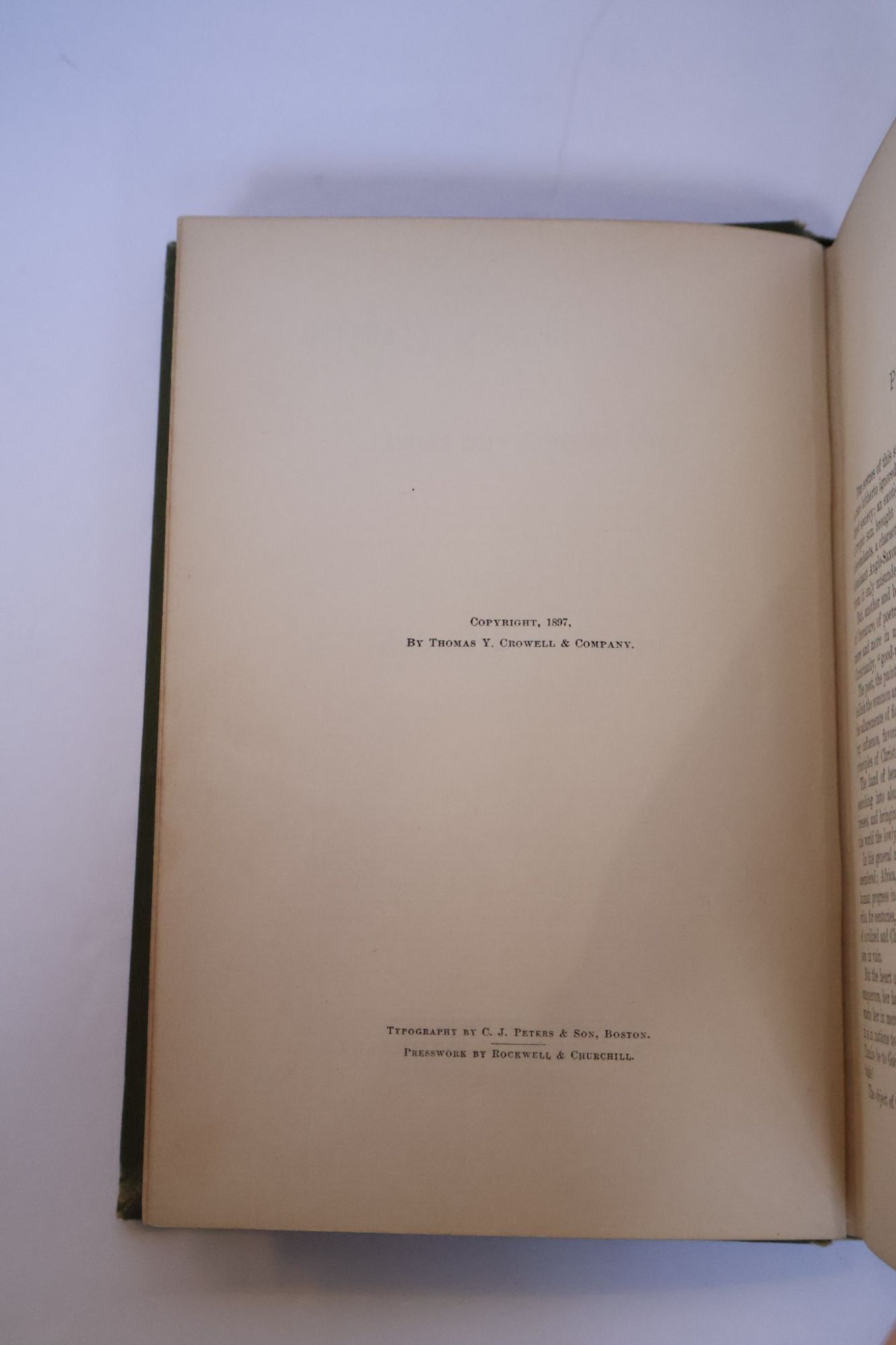 New York: Thomas Y. Crowell & Co, 1897. First Edition thus. Hardcover. Octavo, vi, 490 pages. In Very Good condition. Fully bound in publisher's decorated green cloth. Spine green with gilt lettering. Minor shelfwear and soiling. Slight splitting to gutters. Moderate edgewear and rubbing to boards, corners bumped. Text block toning consistent with age. Shelved under front counter. 1406079. Shelved Dupont Bookstore.