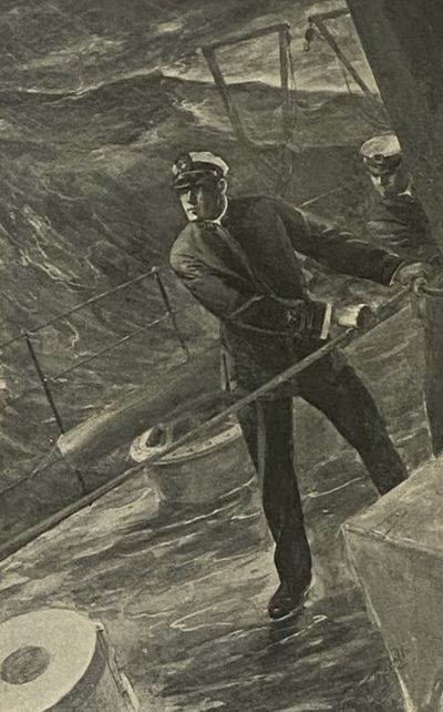 Boston: W.A. Wilde Company, 1912. First Edition. Hard Cover. Good/No Jacket. 0x0x0. Merrill, Frank T. First edition. Light 3 inch stain to fore edge margin of board and first and last two pages only, front board lightly rubbed with minor loss from destroyer image, ink name on front endpaper, front hinge just beginning to weaken. 1912 Hard Cover. 342, [8] pp. 8vo. Includes frontispiece and four plates in text by Frank T. Merrill. A naval adventure written for a juvenile audience, part of the popular Ralph Osborn series, this installment featuring the protagonist aboard a U.S. torpedo boat destroyer.