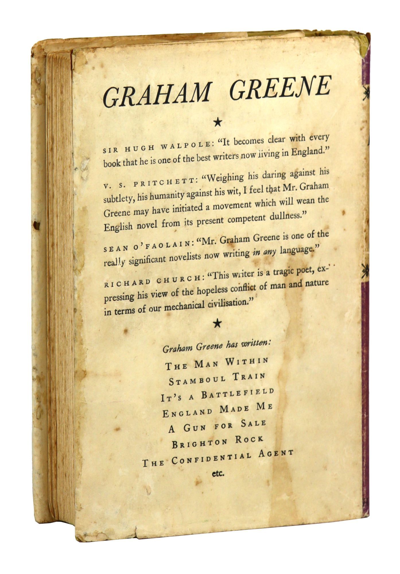 London: William Heinemann Ltd, 1940. Very Good/Very Good -. London: William Heinemann Ltd., 1940. First Edition with "First Published 1940" to copyright page and no additional printings listed; married to a later issue dust jacket with 8s 3d price, four blurbs to rear, but with four reviews to front flap and note of a later printing (likely 2nd or 3rd) scratched out by previous owner. Octavo; 280pp. Printed dust jacket. Yellow cloth stamped in red; tan endpapers. Dust jacket chipped along edges and folds; general rubbing and spotting; closed tear to spine; staining to rear panel. Boards show light edgewear with some bumping. Binding sound; spotting to edges of text block; Very Good in a Good to Very Good dust jacket.