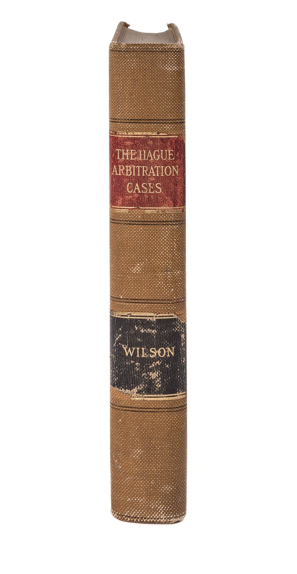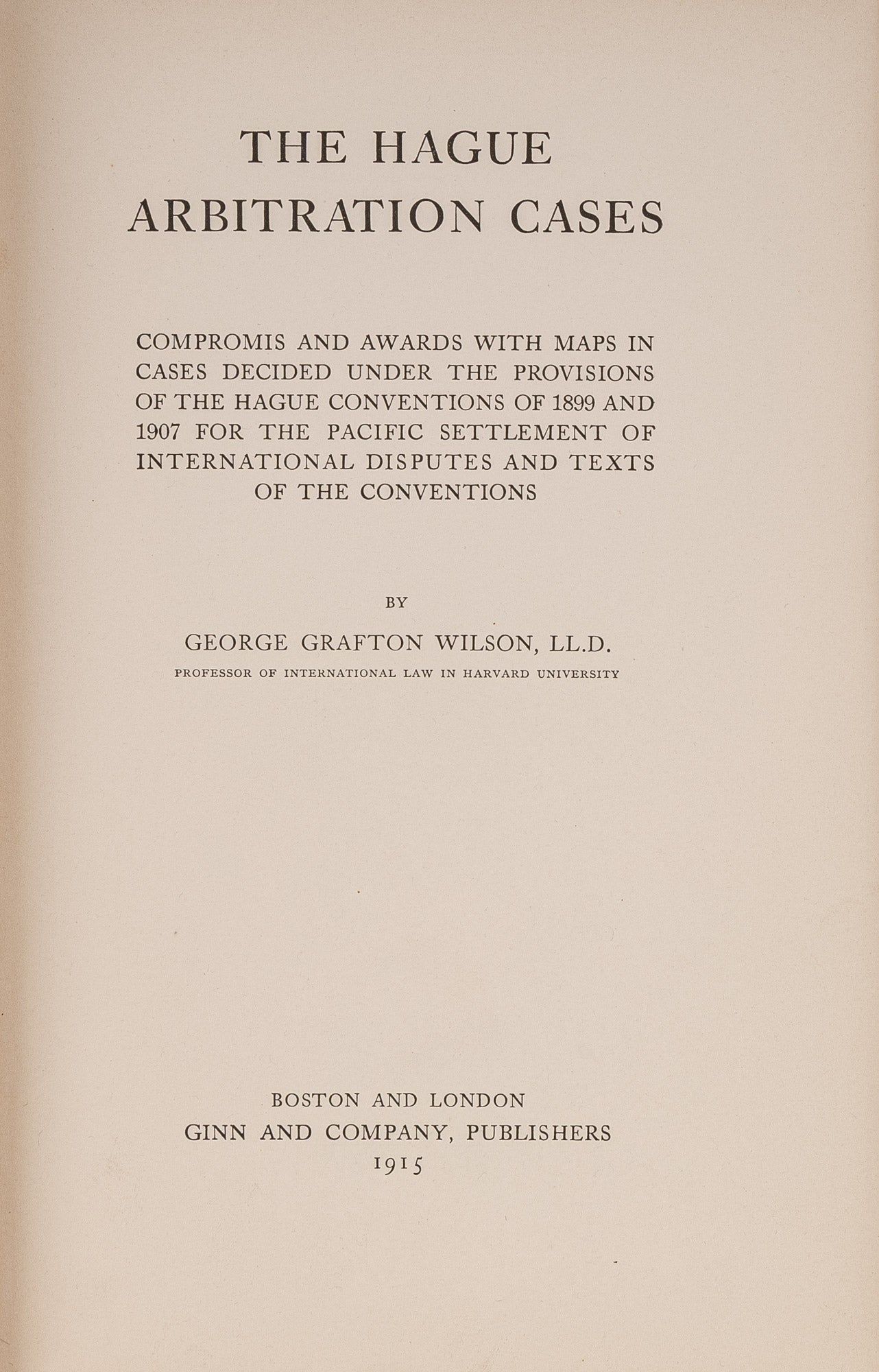 1915. Wilson, George Grafton, [1863-1951]. The Hague Arbitration Cases. Compromis and Awards, with Maps, in Cases Decided Under the Provisions of the Hague Conventions of 1899 and 1907 for the Pacific Settlement of International Disputes and Texts of the Conventions. Boston: Ginn and Co., 1915. x, 525 pp. Tan library buckram with gilt red and black lettering pieces to spine. Blind frames to boards. Worn and rubbed. Internally clean. A good copy. $85. * Contents: I. Pious Fund; II. Preferential Claims Against Venezuela; III. Japanese House Tax; IV. Right of Muscat Dhows to Fly Flag; V. Deserters at Casablanca; VI. Maritime Frontier; VII. North Atlantic Coast Fisheries; VIII. Orinoco Steamship Company; IX. Arrest and Return of Savarkar; X. Canevaro Claim; XI. Interest on Indemnities; XII. The Manuba; XIII. The Carthage; XIV. The Tavignano; XV. Boundaries of the Island of Timor.