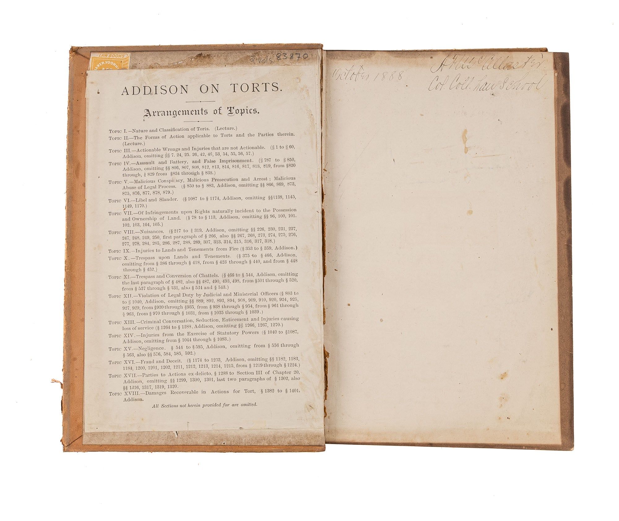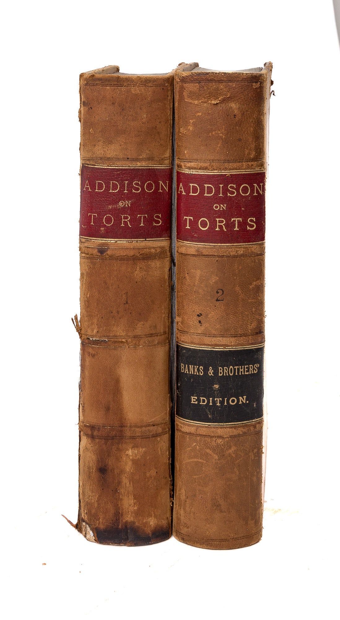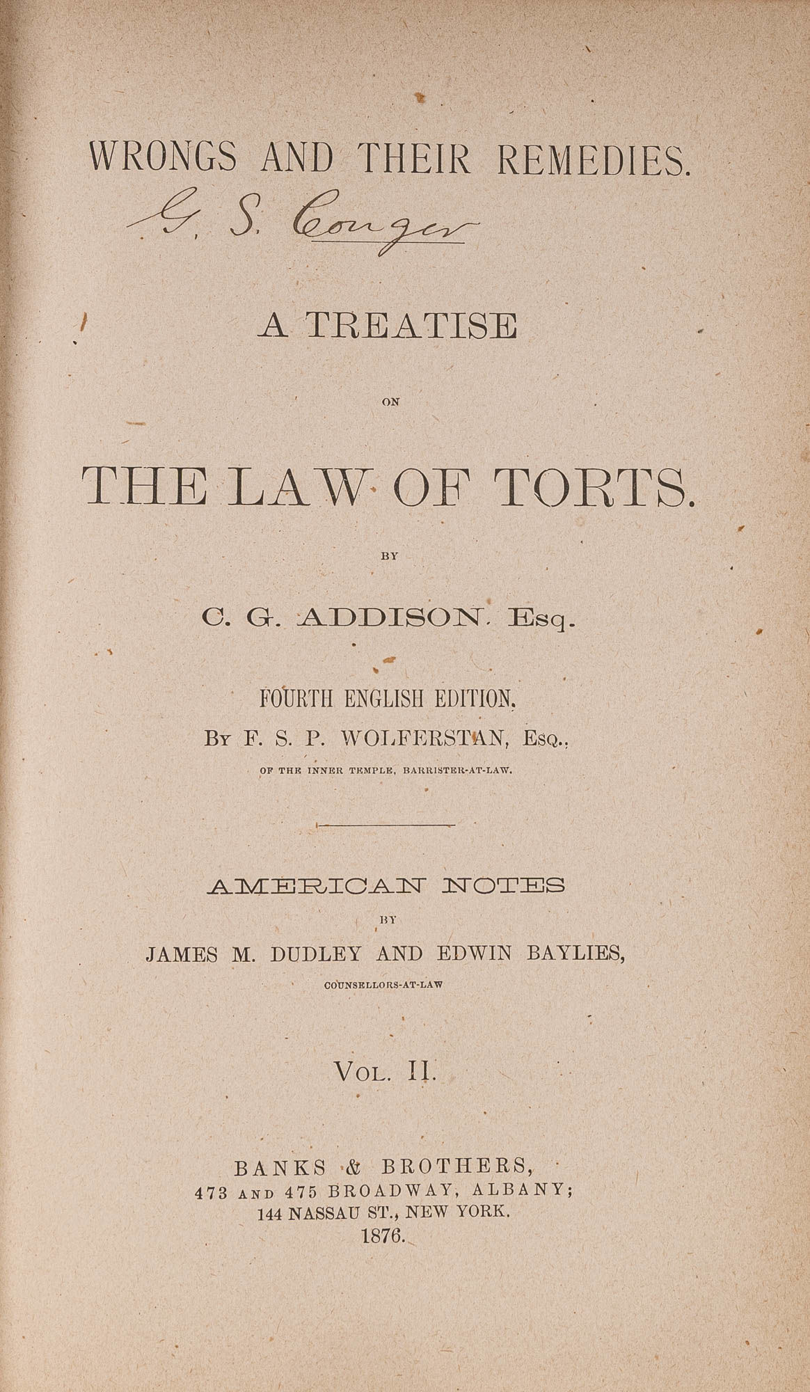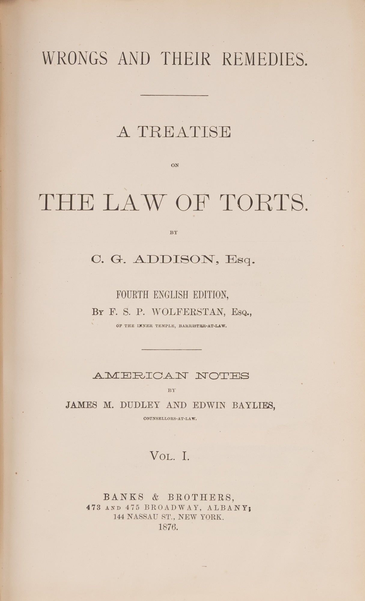 1876. Albany: Banks and Bros., 1876. 4th English ed. Albany: Banks and Bros., 1876. 4th English ed. Addison, C[harles] G[reenstreet]. Wolferstan, F[rancis] S[tafford] P[ipe]. Dudley, James M. Baylies, Edwin. Wrongs and Their Remedies: A Treatise on the Law of Torts. Albany: Banks and Bros., 1876. 4th English edition. 2 volumes. Contemporary law sheep with gilt red and black lettering pieces to spine. Blind frames to boards. Worn and scuffed. List of topics tipped-in to front pastedown. Contemporary previous owner's inscription to front free endpaper of volume one. Second previous owner's signature to front board of volume two. Third previous owner's signature to front pastedown and title page of volume two. Pen annotations to front endleaves of volume one, otherwise internally clean. A good set. $150.