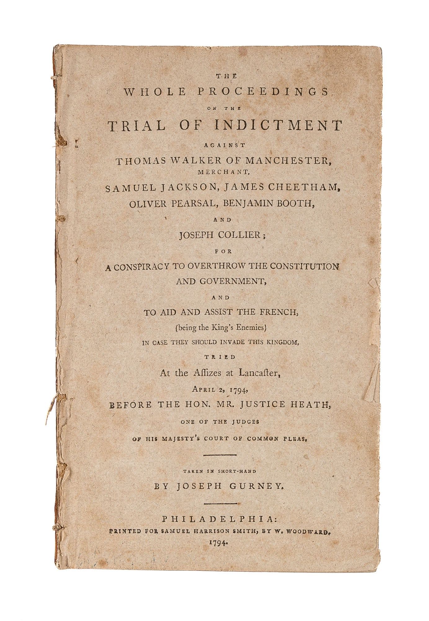 1794. The Treason Trial of a Notable Cotton Merchant & Political Radical [Trial]. Walker, Thomas [1749-1817], Primary Defendant. Gurney, Joseph [1744-1815], Reporter. The Whole Proceedings on the Trial of Indictment Against Thomas Walker of Manchester, Merchant, Samuel Jackson, James Cheetham, Oliver Pearsal, Benjamin Booth, And Joseph Collier; For a Conspiracy to Overthrow the Constitution and Government, And to Aid and Assist the French (Being the King's Enemies) in Case They Should Invade this Kingdom, Tried at the Assizes at Lancaster, April 2, 1794, Before the Hon. Mr. Justice Heath, One of the Judges of His Majesty's Court of Common Pleas. Philadelphia: Printed for Samuel Harrison Smith, by W. Woodward, 1794. xii, 13-104, xix, [1] pp. Octavo (8" x 5"; 20.6 x 12.7 cm). Disbound. Moderate toning, occasional light foxing, title page detaching at foot. A good copy. $500. * Only American edition, one of two issues. A cotton merchant by trade, Walker was a well-connected radical and social reformer. His circle of friends and acquaintances included Thomas Paine, Charles James Fox, Josiah Wedgwood, Joseph Priestley and John Horne Tooke. He and his friends aroused suspicion during the anti-radical hysteria in Great Britain that followed the outbreak of the French Revolution, and were tried for treason. This trial is memorable for Lord Erskine's famous cross-examination, which discredited the Crown's principal witness, and lengthy jury address. Cohen, Bibliography of Early American Law 12222.