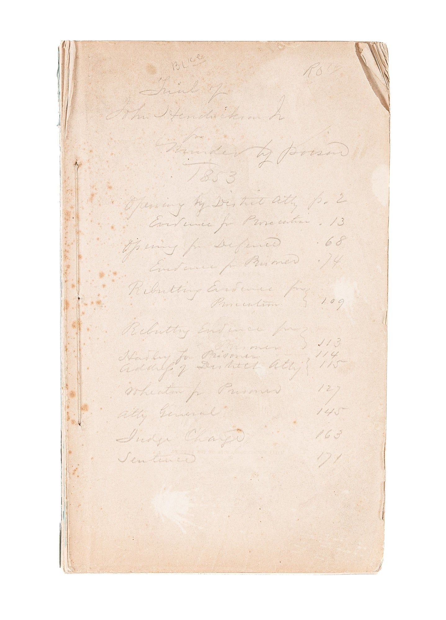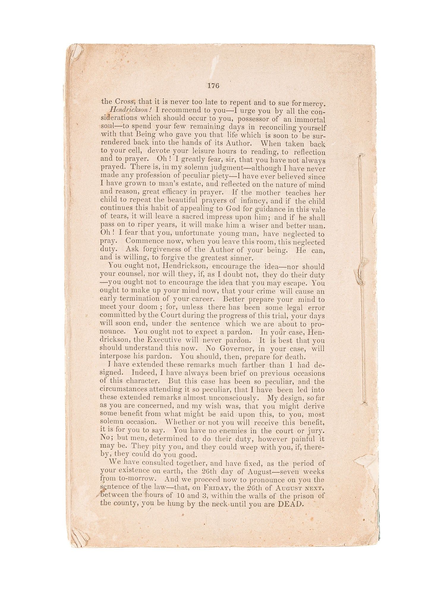 1853. Albany: David M. Barnes and W.S. Hevenor, 1853. Albany: David M. Barnes and W.S. Hevenor, 1853. McDade 468 [Trial]. Hendrickson, John [1832-1854], Defendant. Barnes, David M., Reporter, Compiler. Hevenor, W.S. [d.1909], Reporter, Compiler. Trial of John Hendrickson, Jr. For the Murder of His Wife Maria, By Poisoning, at Bethlehem, Albany County, N.Y., March 6th, 1853: Tried in the Court of Oyer and Terminer, at Albany, N.Y., In June and July, 1853. Albany: David M. Barnes and W.S. Hevenor, Publishers, 1853. 176 pp. Woodcut frontispiece depicting John Hendrickson and Maria Hendrickson. Octavo (9-1/4" x 5-3/4"; 23.5 x 14.6 cm). Disbound stab-stitched pamphlet, wrappers lacking. Moderate toning, light soiling to exterior, corner folds to several leaves at beginning of text, early manuscript table of contents to verso of frontispiece. A good copy overall. $125. * Only edition. John Hendrickson was a wastrel who married into the wealthy Van Dusen family of Albany, NY. Unfaithful to his wife and eager to acquire her fortune, he poisoned her with aconite. This is believed to be the first American murder committed with this substance. New ground was broken by the forensic testimony presented in this case by several experts, most notably Benjamin Silliman, the eminent chemist and Yale professor. OCLC locates 3 copies, 1 in a law library (Harvard). McDade, The Annals of Murder 468.