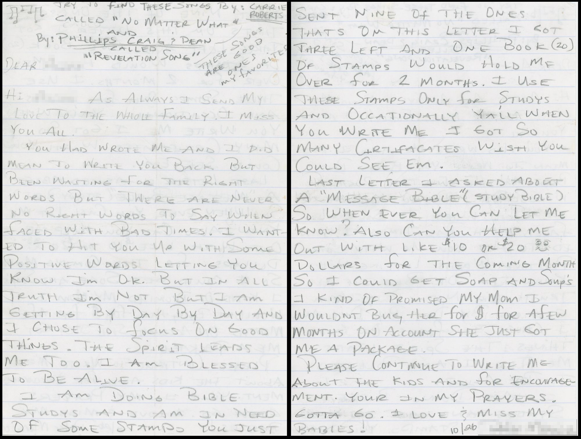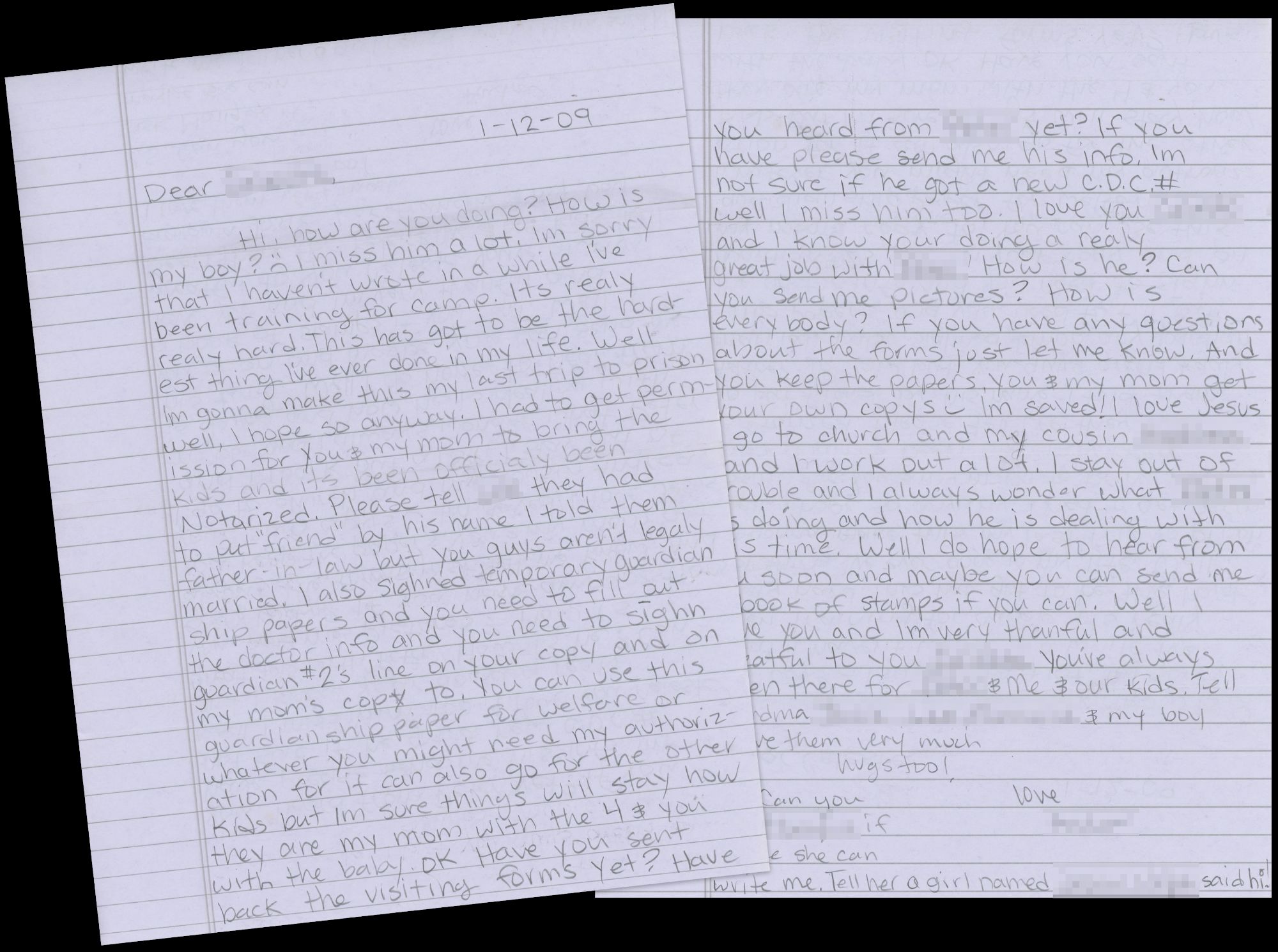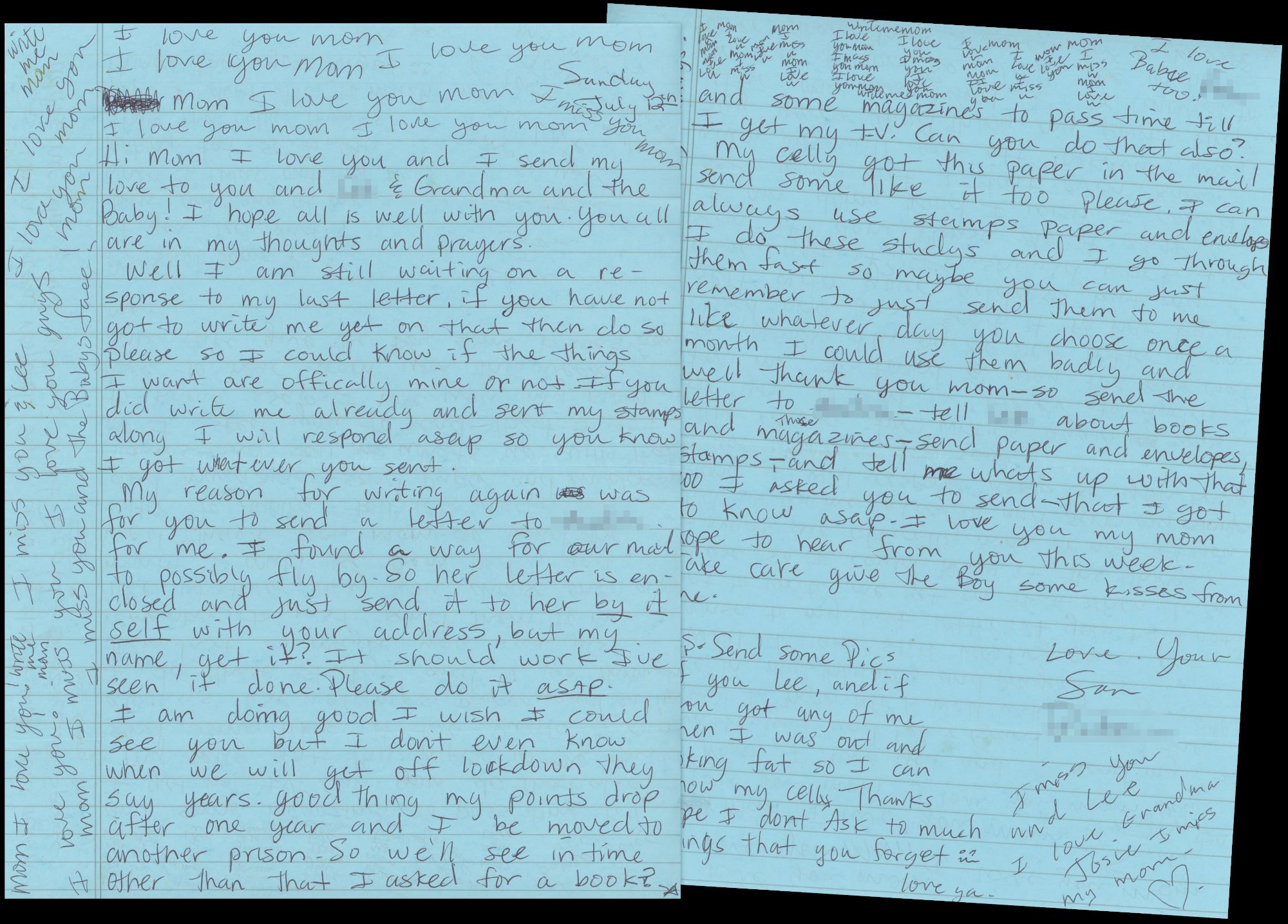 P., on a longer sentence in various higher-security facilities, grappled with boredom, loneliness, and the bureaucracy involved in trying to contact his wife and family. The prisons where he was incarcerated were frequently on lockdown for months at a time, including the Corcoran Substance Abuse Treatment Facility, which locked down in June of 2009 following a gang-related riot. He often describes being hungry and not allowed to go to the commissary, either because of lockdowns or just because “there not letting Hispanics go” (January 30, 2011).
