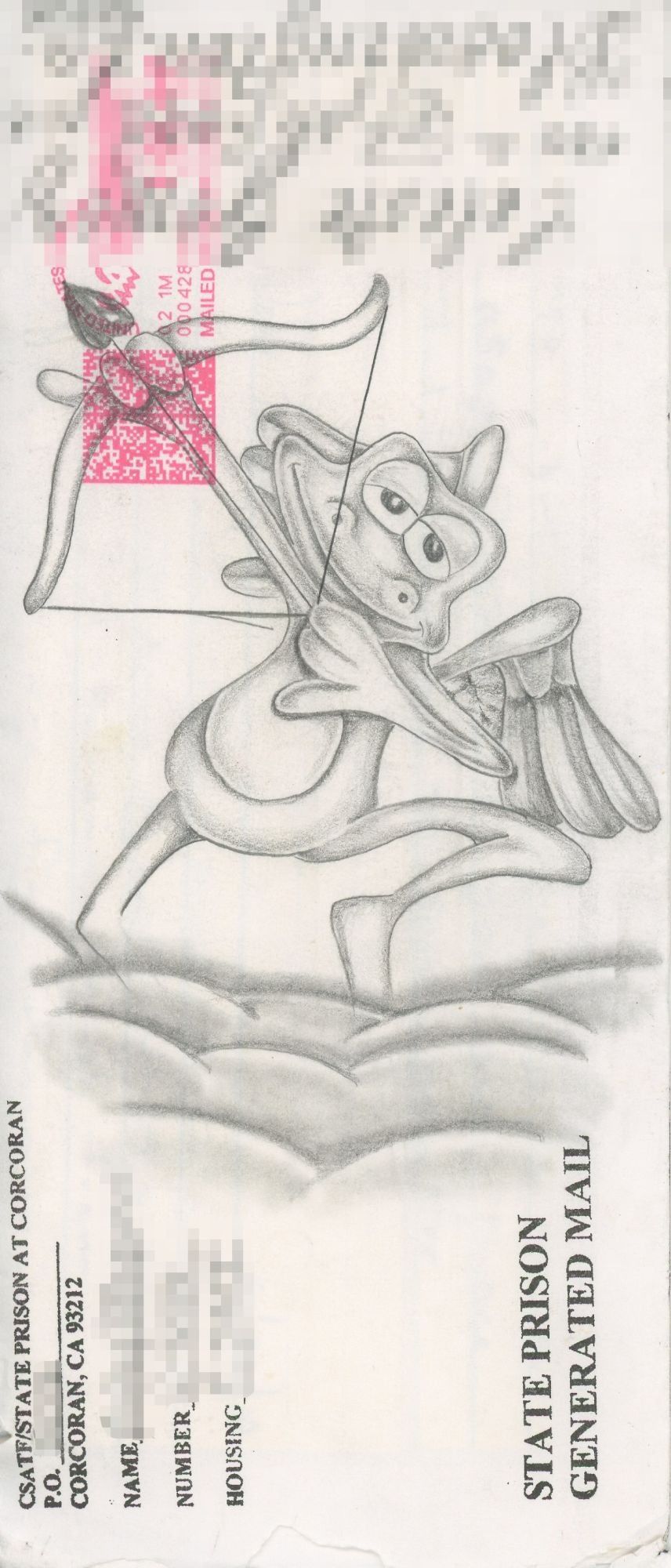California, 2015. Eighty letters, ten artworks, and two photographs. Anonymized for writers’ and their families’ privacy, with more information available on request. Overall excellent.. Offered here is a collection of letters and art sent from people incarcerated in the California State Prison system, primarily from a husband (“P.”) and wife (“A.”) to P’s mother and stepfather.